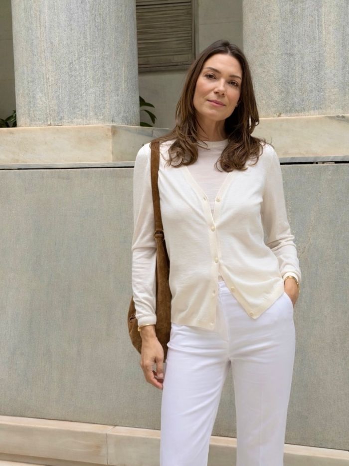 Για layering, ένα εκρού ζακετάκι σαν αυτό στο σύνολο της Βίκυς Καγιά ή ένα ελαφρύ πανωφόρι σε παρόμοιο τόνο είναι ιδανικό. Δημιουργεί επίπεδα στο outfit χωρίς να «σπάει» τη μονοχρωμία. Το μυστικό εδώ είναι να παίξεις με διαφορετικές υφές.