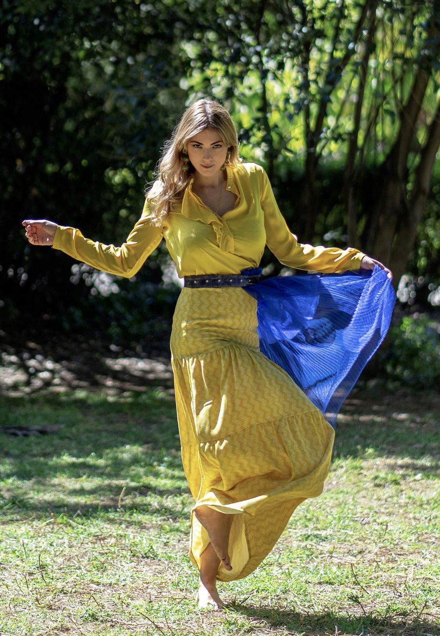 Δέσποινα: Φόρεμα Stelios Koudounaris, φούστα Liu Jo (Shop&Trade), μαντήλι Attrattivo, ζώνη και παπούτσια από προσωπική συλλογή
