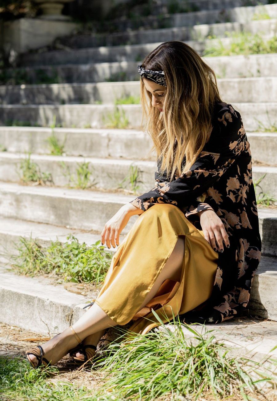 Φόρεμα Kocca (Shop&Trade), παντελόνι Artigli (Shop&Trade), μαντήλι από προσωπική συλλογή, κολιέ Coveos Jewelry, ζώνη A.L.E., πέδιλα Pepe Jeans (Shop&Trade)