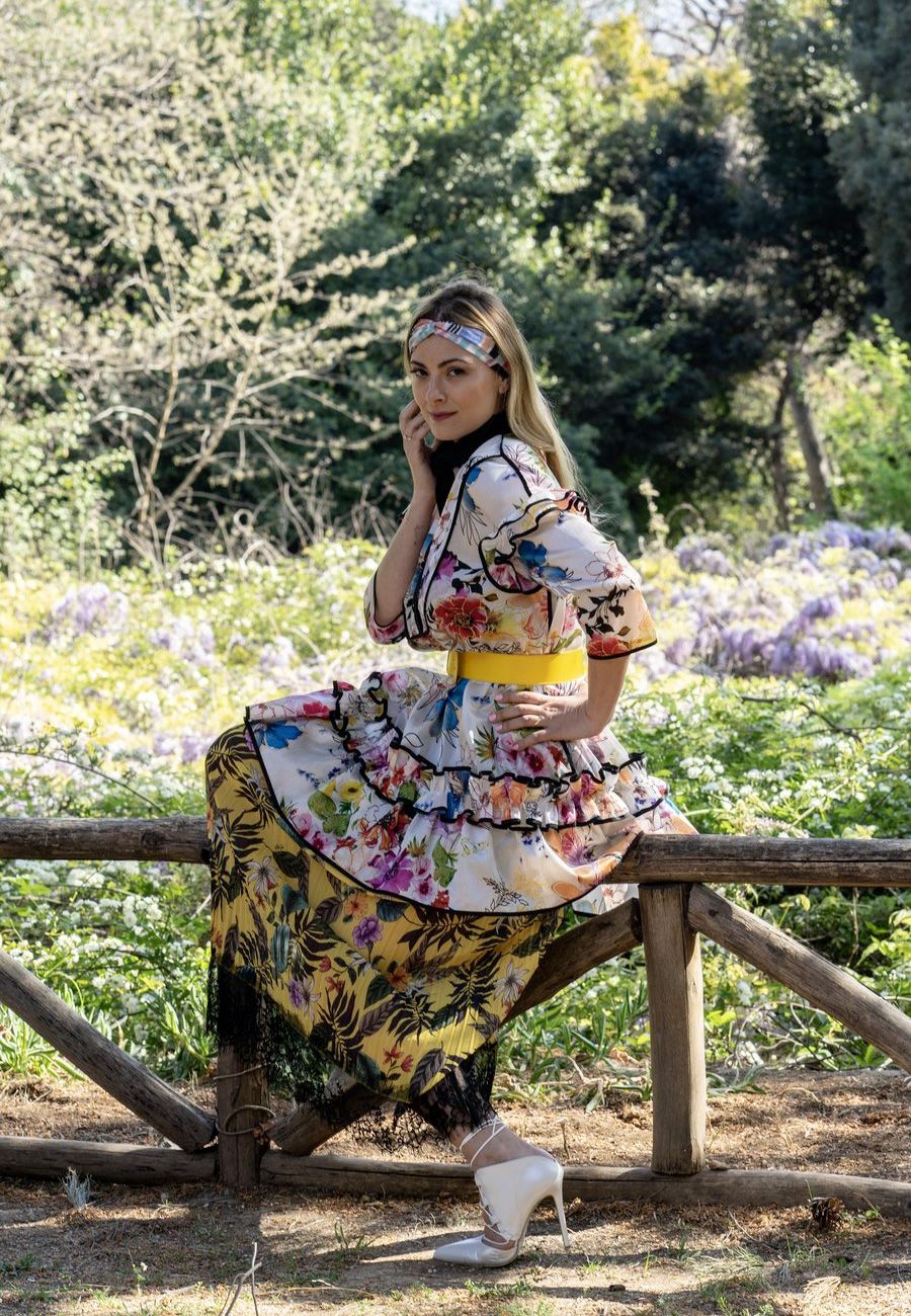 Spanish romanticism στην πιο θηλυκή εκδοχή του με φούστα με λεπτομέρειες από δαντέλα και φόρεμα με βολάν, όλα σε λουλουδάτες αποχρώσεις.