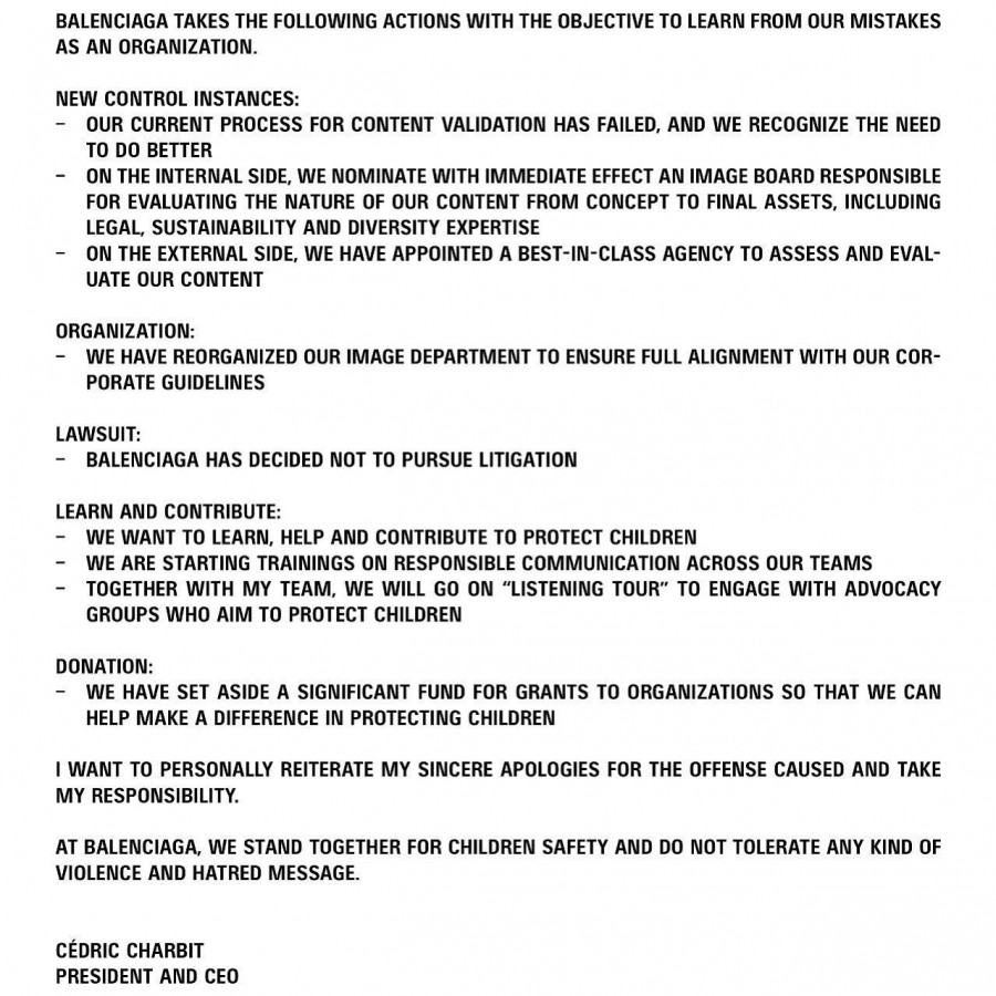 «Πρέπει να μάθω από αυτό, να ακούσω και να συνεργαστώ με οργανώσεις προστασίας των παιδιών, προκειμένου να μάθω πώς μπορώ να συνεισφέρω και να βοηθήσω σε αυτό το τρομερό θέμα. Ζητώ συγγνώμη από οποιονδήποτε προσβλήθηκε από τα γραφικά και ο οίκος Balenciaga έχει εγγυηθεί ότι θα ληφθούν τα κατάλληλα μέτρα, όχι μόνο για την αποφυγή παρόμοιων λαθών στο μέλλον, αλλά και για την ανάληψη ευθύνης για την προστασία της παιδικής ευημερίας με κάθε τρόπο».
