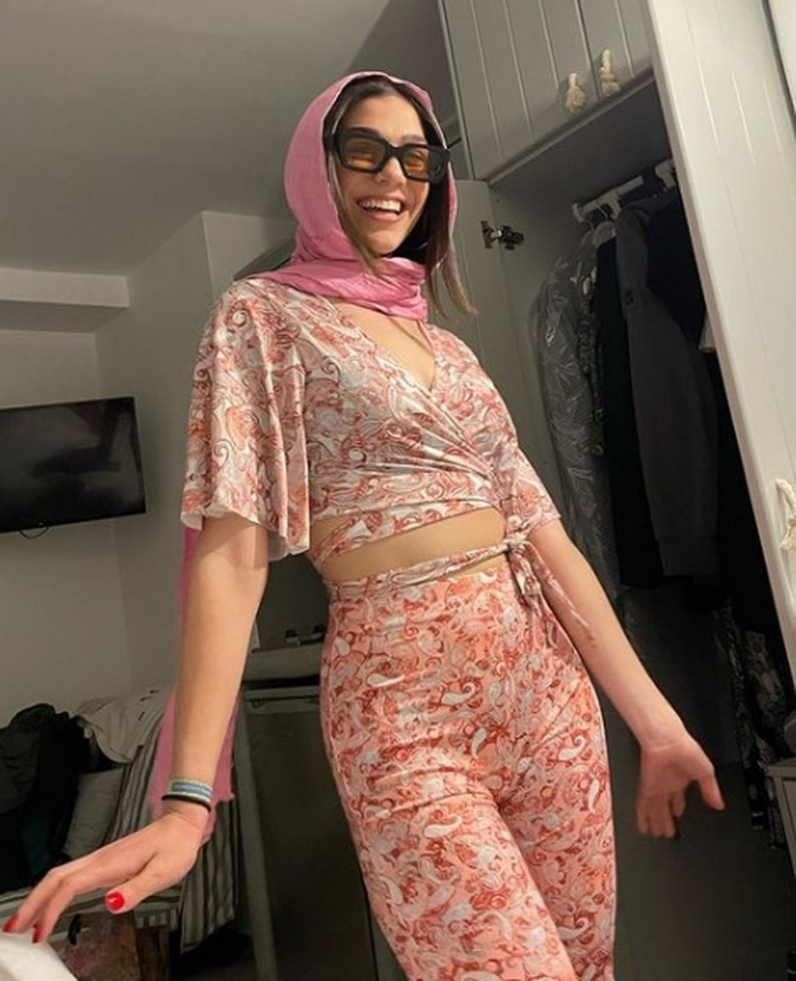 Το σύνολο περιλαμβάνει ένα wrap, crop top και ένα παντελόνι τύπου capri από λαχούρι. Η μελαχρινή νεαρή το συνδύασε, με χιουμοριστική διάθεση, και με ένα ροζ μαντίλι στα μαλλιά και oversized γυαλιά ηλίου, δίνοντας τη δική της εκδοχή στο Saint Trope style.