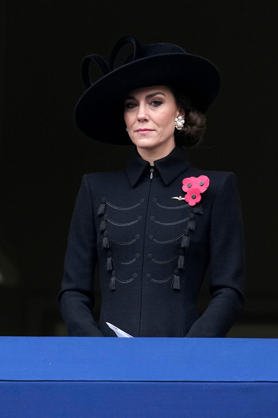 Η πριγκίπισσα της Ουαλίας εμφανίστηκε με το ίδιο σακάκι που φόρεσε και το 2019 την ίδια μέρα. Μιλάμε για ένα item σε στρατιωτικό στυλ από την Catherine Walker & Co, το οποίο συμπλήρωσε με μια ασημένια καρφίτσα, που της απονεμήθηκε όταν έγινε Αρχηγός του Στόλου Αεροπορικού Στρατού νωρίτερα φέτος. Φυσικά, από την εμφάνιση δεν έλειπε και η κλασική, συμβολική καρφίτσα με τις κόκκινες τουλίπες, δείγμα ειρήνης, αλλά και τα μεγάλα σκουλαρίκια της βασίλισσας Ελισάβετ με μαργαριτάρια και διαμάντια. Το μεγάλο, μαύρο της καπέλο δημιουργήθηκε από τον Philip Treacy και είναι ένα από τα αγαπημένα items της πριγκίπισσα Kate, που το φοραέι στο repeat.