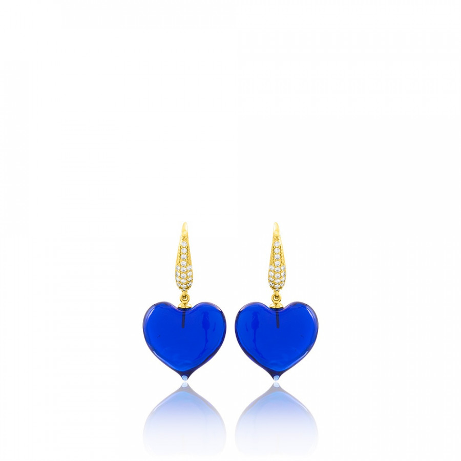 Αν, λοιπόν, ανήκεις στην κατηγορία των fashionistas που πάντα ακολουθούν τις τάσεις της μόδας, τότε ένα ζευγάρι heart-shaped σκουλαρίκια που θα δημιουργήσουν την τέλεια pop πινελιά στο look σου, δεν γίνεται να λείπει από την συλλογή σου. Φυσικά ο λόγος για τα κίτρινα επιχρυσωμένα σκουλαρίκια από ορείχαλκο με μπλε καρδιά και λευκά ζιργκόν -Anna Maria Mazaraki New Collection- που μπορείς να φορέσεις με μαζεμένα τα μαλλιά πίσω, στο γραφείο με το αγαπημένο σου blazer αλλά και το βράδυ με ένα κομψό slip dress.