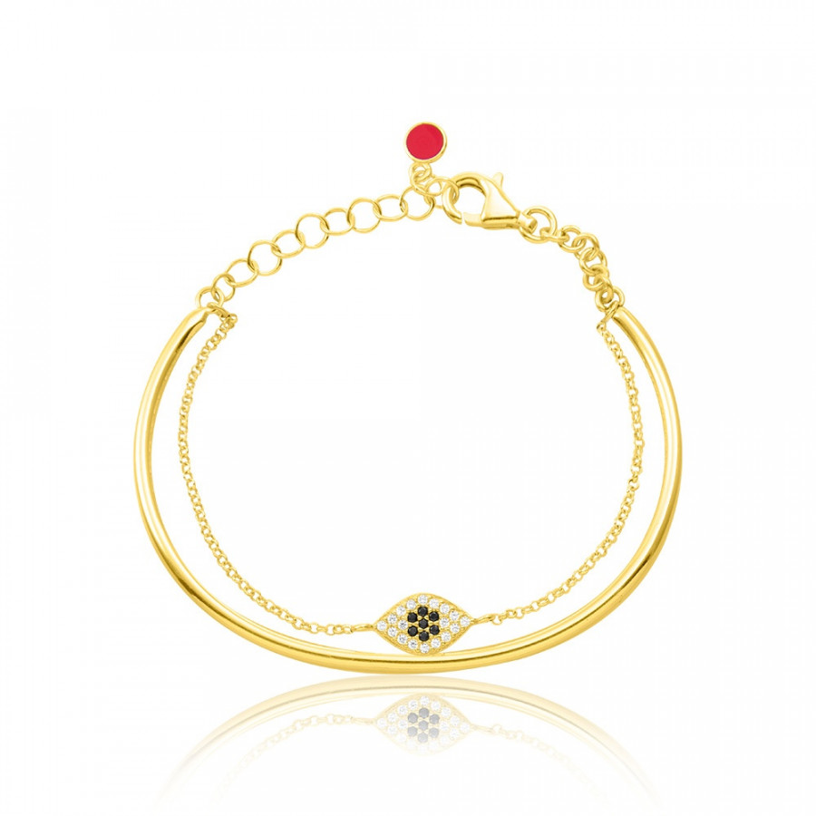 Τι θα έλεγες, λοιπόν, για το κίτρινο επιχρυσωμένο βραχιόλι χειροπέδα με αλυσίδα και μοτίφ μάτι από λευκά και μαύρα ζιργκόν, που μπορείς να βρεις στη νέα συλλογή της Anna Maria Mazaraki;