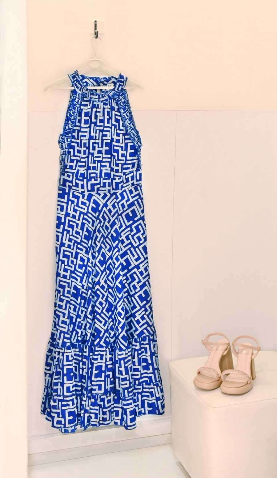 Από την άλλη, ένα θηλυκό halter φόρεμα είναι must για κάθε καλοκαίρι και πόσο μάλλον το maxi αμάνικο halter φόρεμα της εταιρίας Ble Resort Collection, με γεωμετρικά σχέδια, χρυσές λεπτομέρειες και βολάν στο τελείωμα, από το κατάστημα Kelly's Shop.