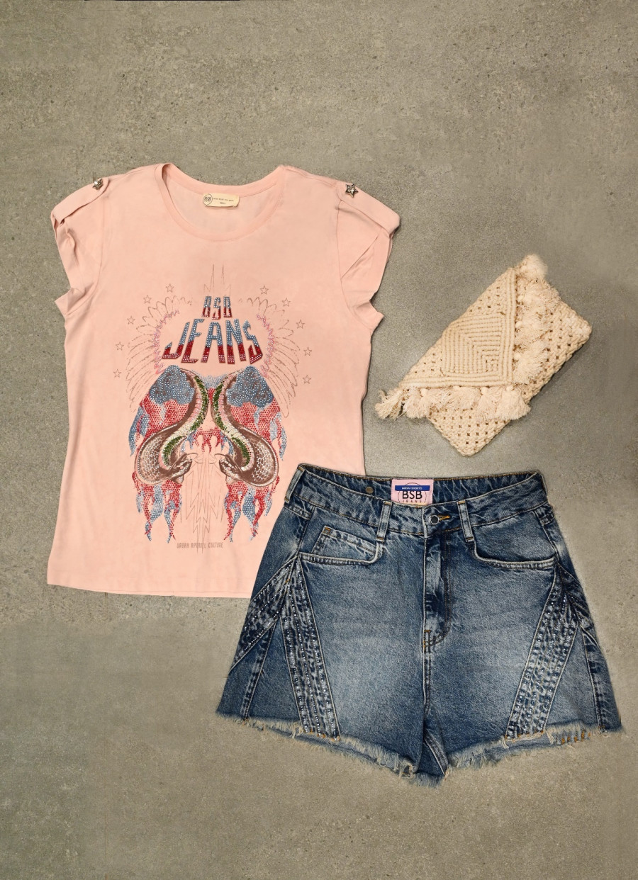 Από την άλλη, ένα πιο extravagant t-shirt είναι απαραίτητο για όλες τις βραδινές εμφανίσεις του καλοκαιριού και πόσο μάλλον το ροζ κοντομάνικο με στρας από το κατάστημα της BSB.