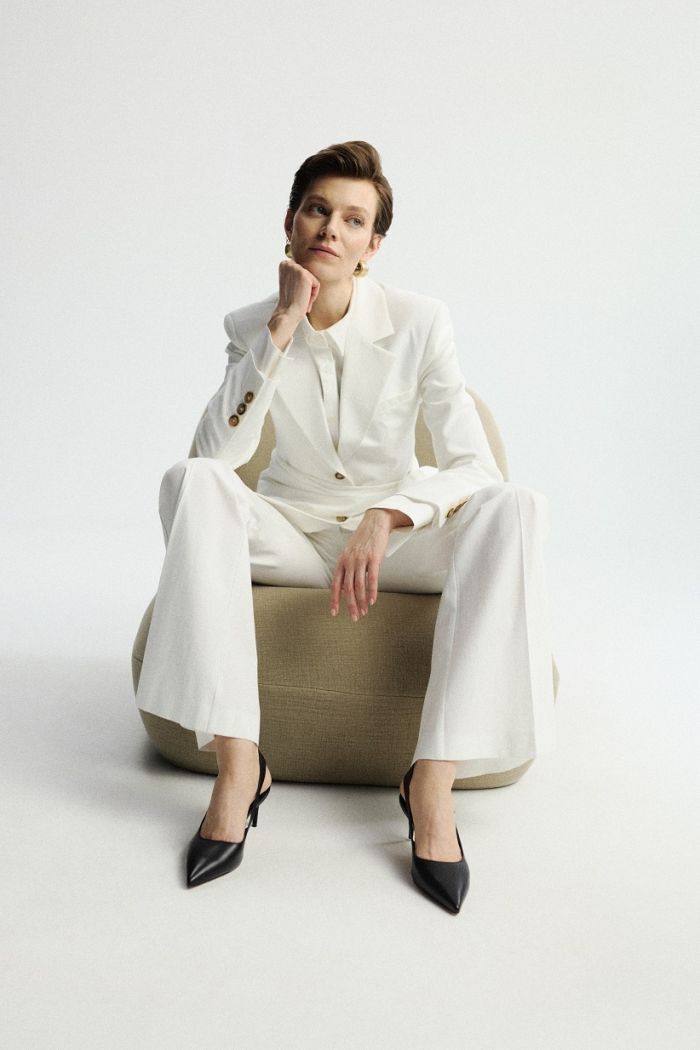 Στην πρώτη γραμμή βρίσκεται μια σειρά από κοστούμια, κατασκευασμένα από φυσικά υλικά, στο πνεύμα της κομψής απλότητας.