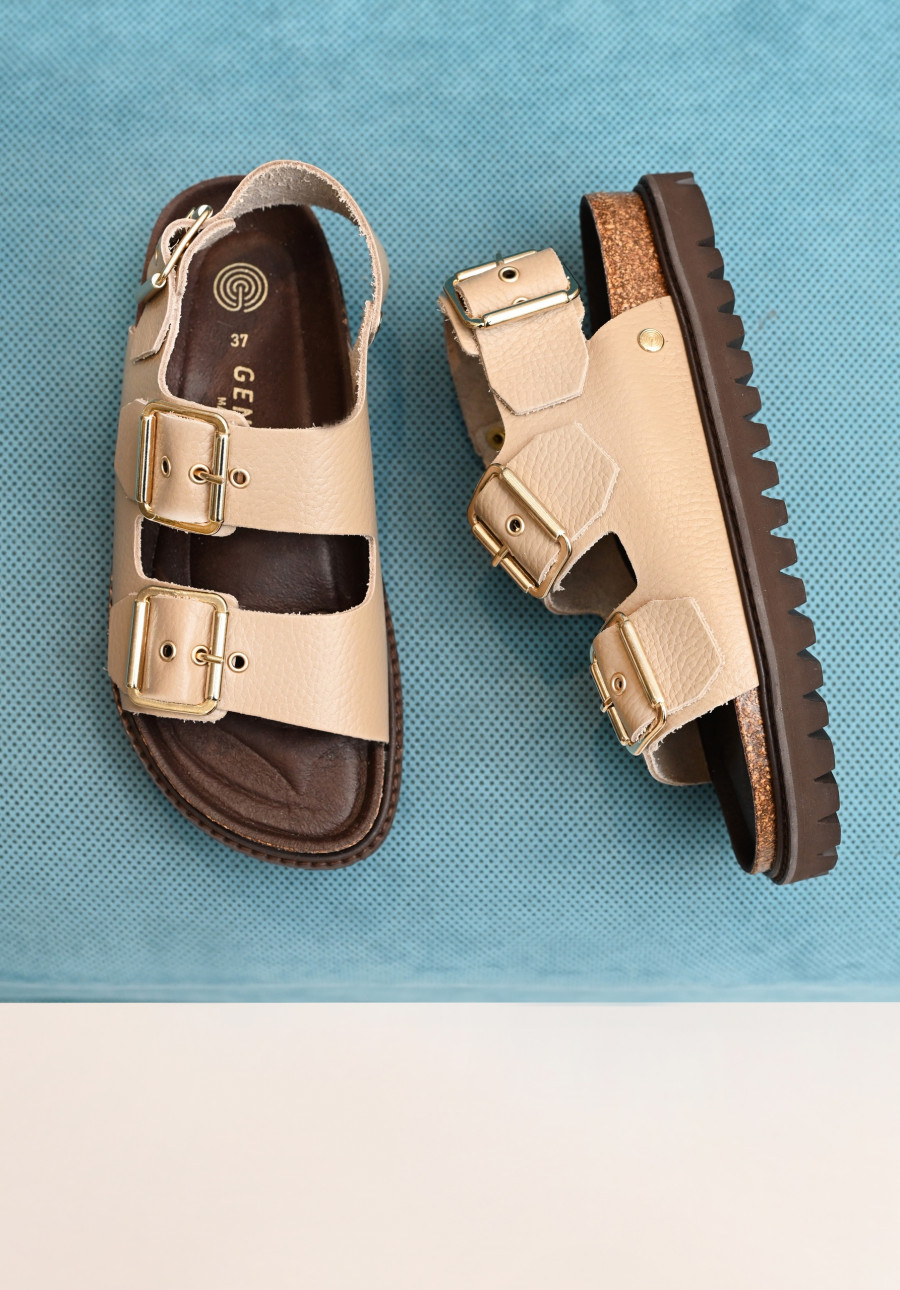 Για τις πολύωρες βόλτες στα σοκάκια του νησιού, το ανατομικό Bio Genuins δερμάτινο μπεζ πέδιλο, με χρυσές λεπτομέρειες και ρυθμιζόμενα λουράκια, από το κατάστημα Ανατομικά Σακελλάρη, είναι η ιδανική επιλογή που συνδυάζει στυλ και άνεση.