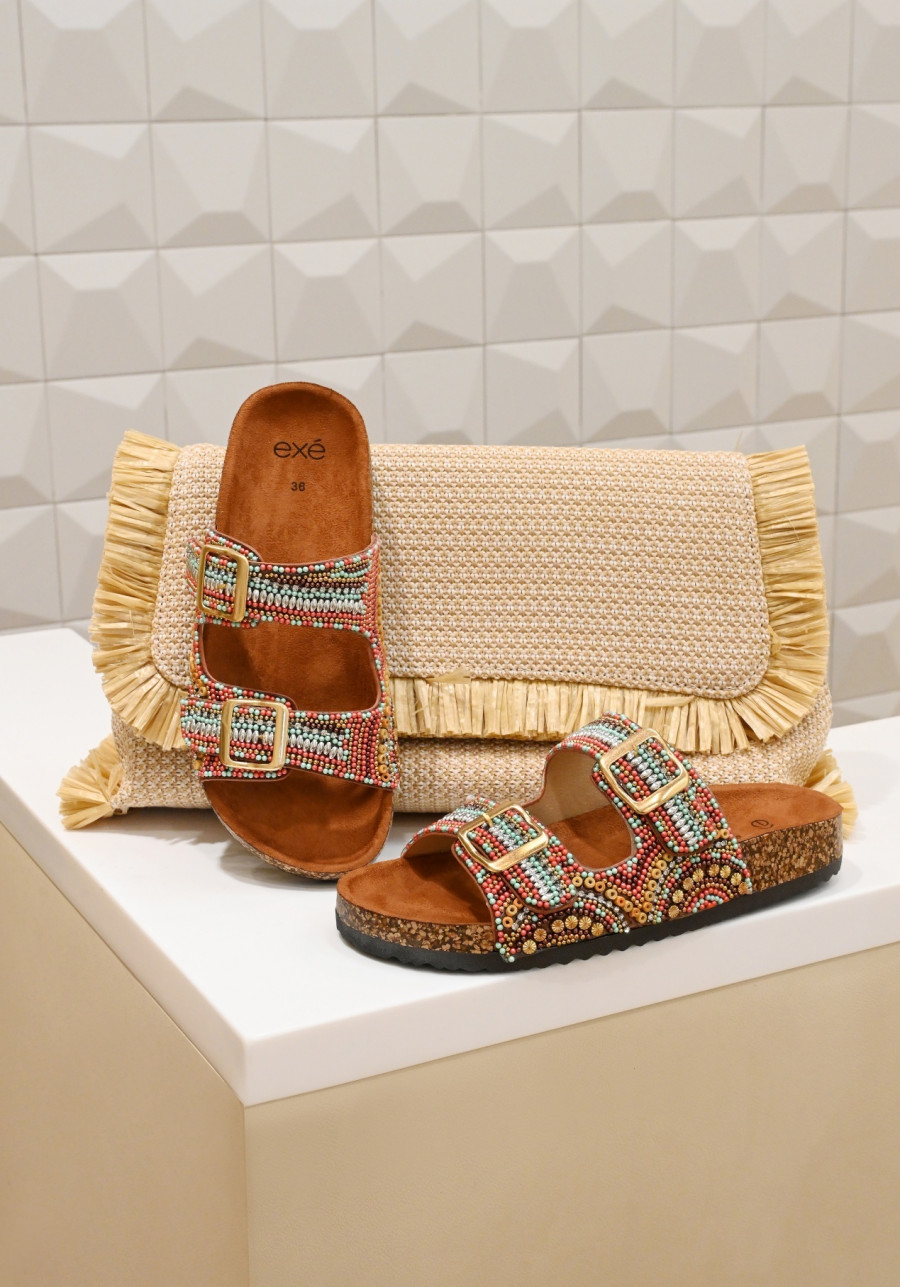 Τώρα, αν θέλεις να δώσεις ένα πιο fancy twist στο look σου, τα εντυπωσιακά flats με boho στοιχεία από το κατάστημα exé, σε ταμπά τιρκουάζ απόχρωση, είναι μια καλή επιλογή.