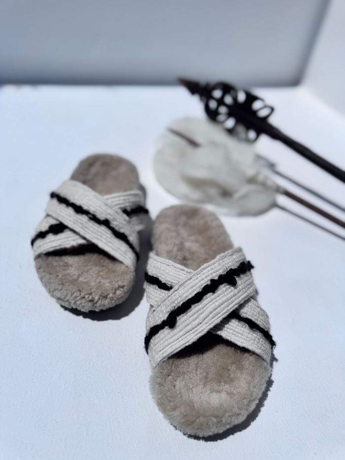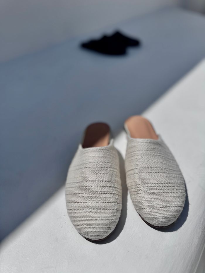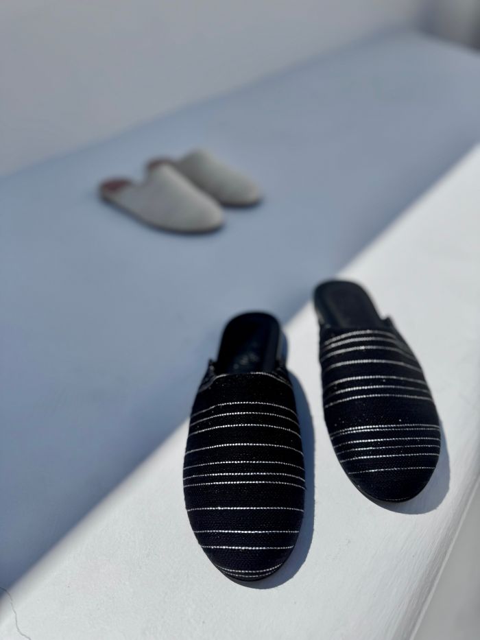 Τα Slippers, επίσης διαθέσιμα σε δύο χρώματα, συνδυάζουν οργανικό βαμβάκι και μεταλλονήματα με σύγχρονα στοιχεία, γεφυρώνοντας την παράδοση με τη σύγχρονη αισθητική.
