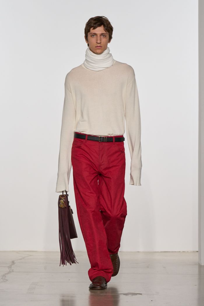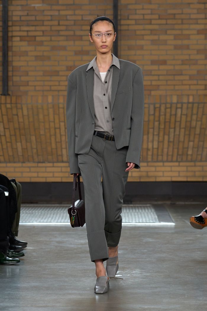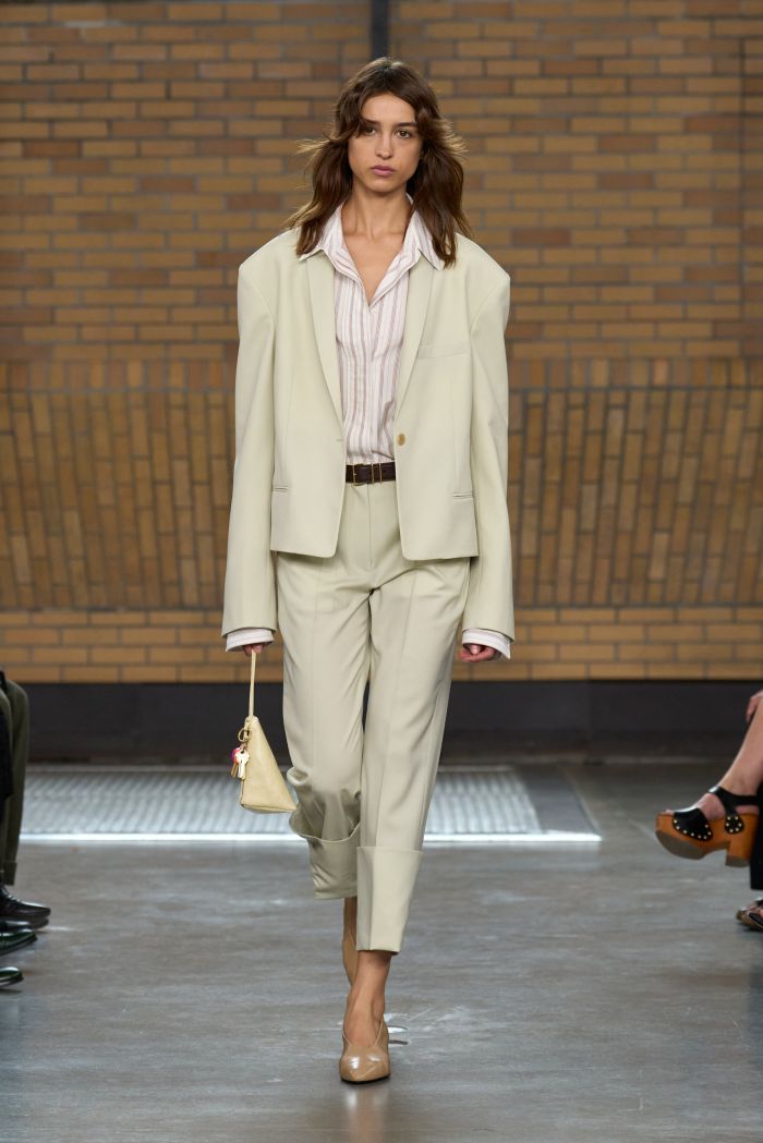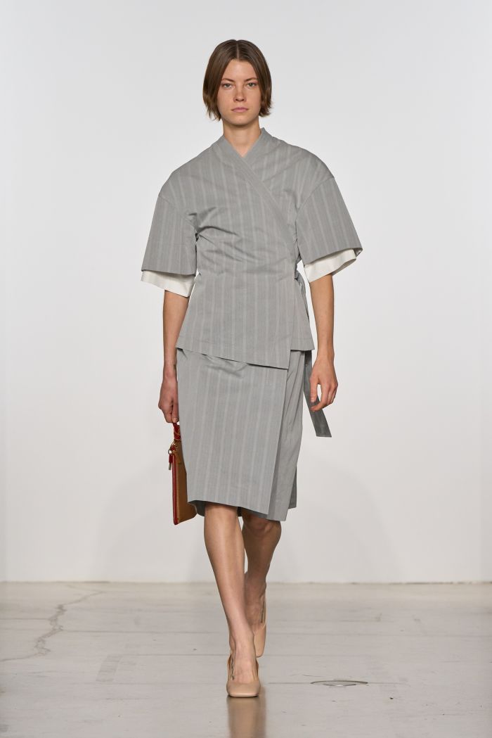 Τα εσώρουχα μετατρέπονται σε πρωταγωνιστή, με την επιρροή τους να αποτυπώνεται σε camisole και slip φορέματα με δαντελένιες λεπτομέρειες και λουράκια γυαλιών, κορυφώνοντας σε ένα tweed υφαντό φόρεμα με τα iconic λογοτυπημένα λάστιχα της μάρκας. Στα prêt-à-porter, οι σιλουέτες κυμαίνονται από ψηλές και λεπτές, σε cropped και αποκαλυπτικές, μέχρι χαλαρές και πολυεπίπεδες, με έμφαση στη μελετημένη ραπτική, τα ανάλαφρα drapery και τις λεπτομέρειες με κρόσσια. Ραφιναρισμένα μάλλινα, τεχνικά υφάσματα με washed και waxed επεξεργασίες, liquid jersey και μεταξωτά παρουσιάζονται σε μια urban ουδέτερη παλέτα λευκού, μαύρου και γκρι, με πινελιές ροζ, κόκκινου, γαλάζιου και πράσινου fern. Τα υφάσματα - και ιδιαίτερα τα δέρματα - αποκτούν νέες απτικές υφές: laser-cut ώστε να θυμίζουν πετσετέ ύφασμα, σε συνθέσεις intarsia, αλλά και με χειροποίητες και κροσέ τεχνικές που μεταμορφώνονται σε fringe φορέματα.