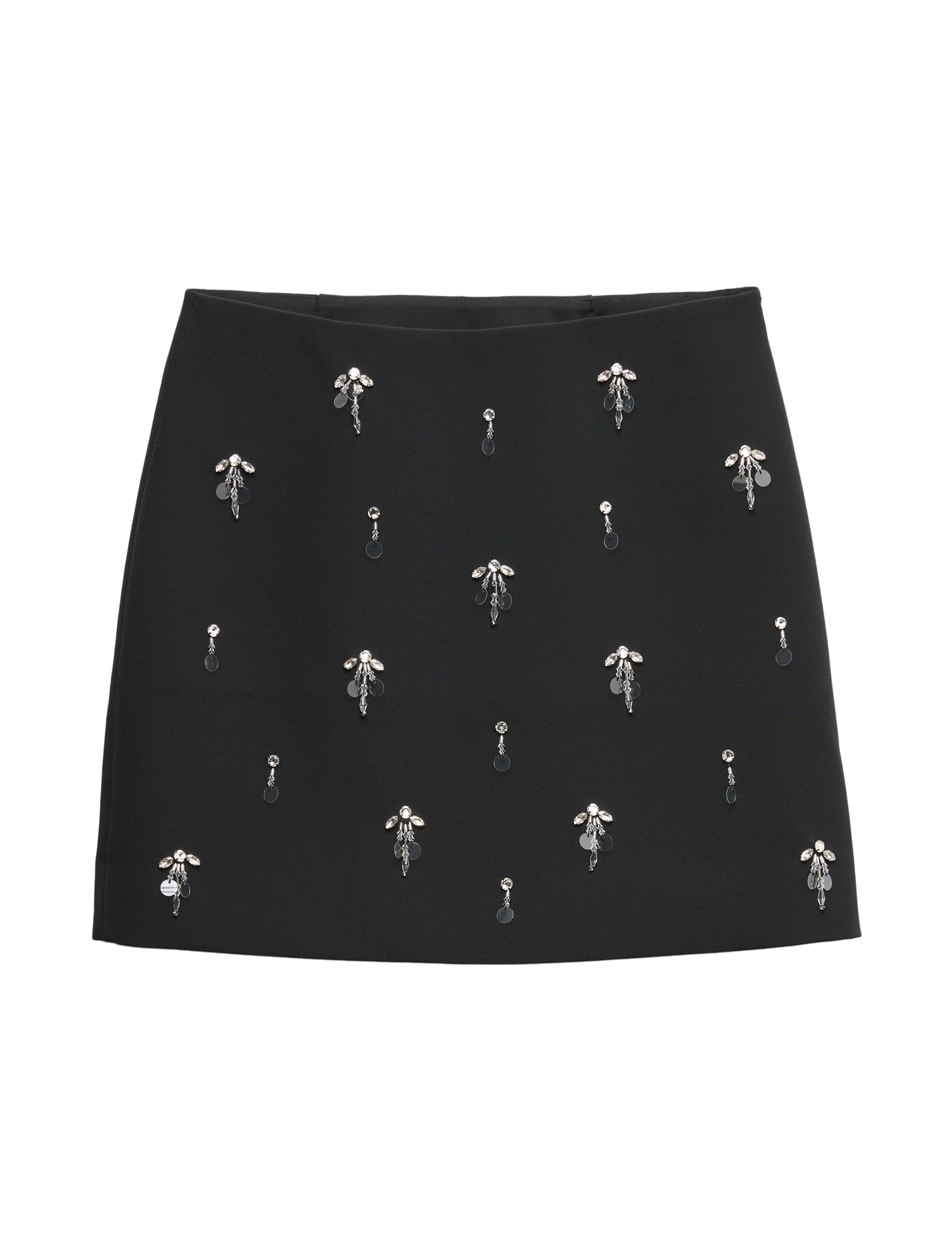 Η συλλογή περιλαμβάνει επίσης statement φούστες, όπως τη μαύρη embellished mini φούστα με κρυστάλλους (T59/8765S), η οποία προσθέτει άμεση λάμψη σε κάθε σύνολο. Πρόκειται για ένα κομμάτι που ενσωματώνει διακριτικές αλλά εντυπωσιακές διακοσμήσεις, κάνοντάς το ιδανικό για συνδυασμό με minimal tops, αλλά και πιο τολμηρές επιλογές.