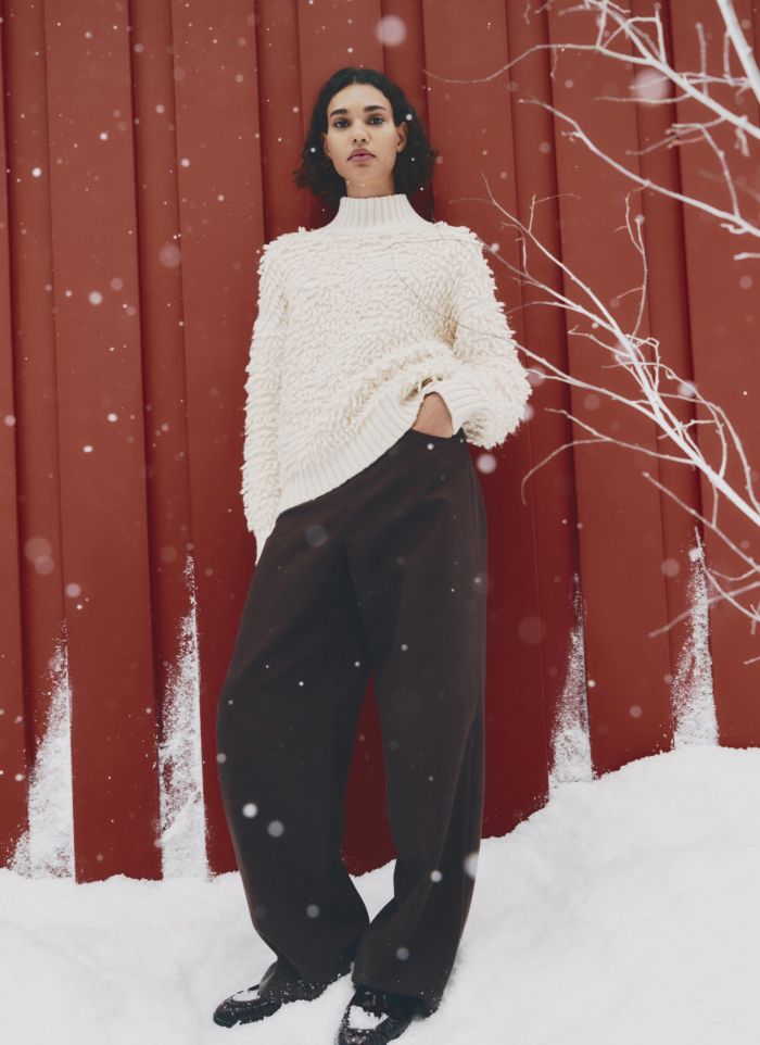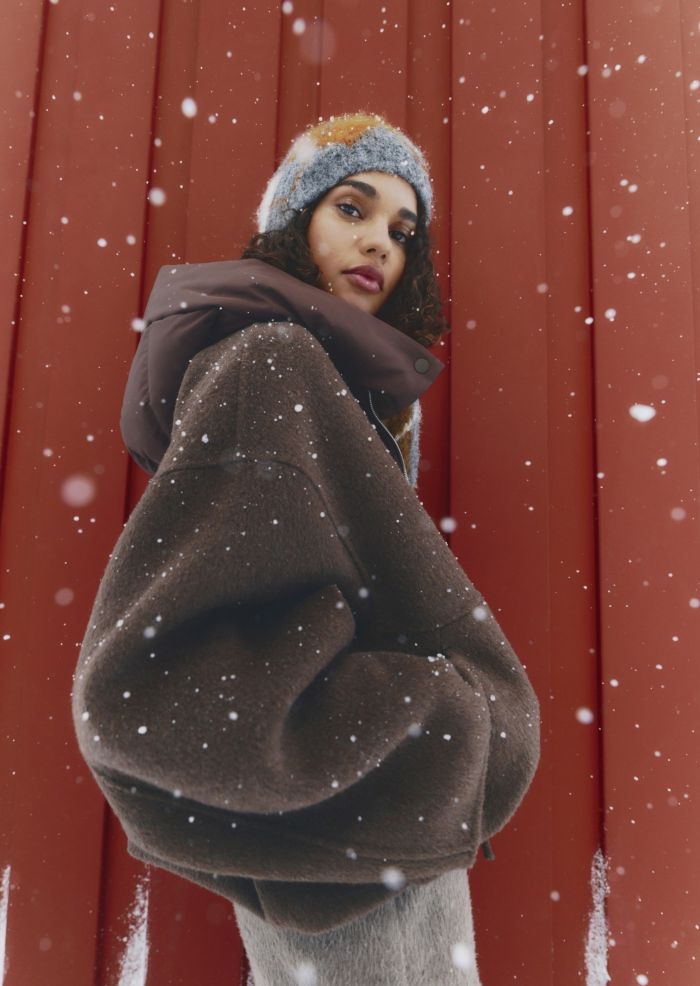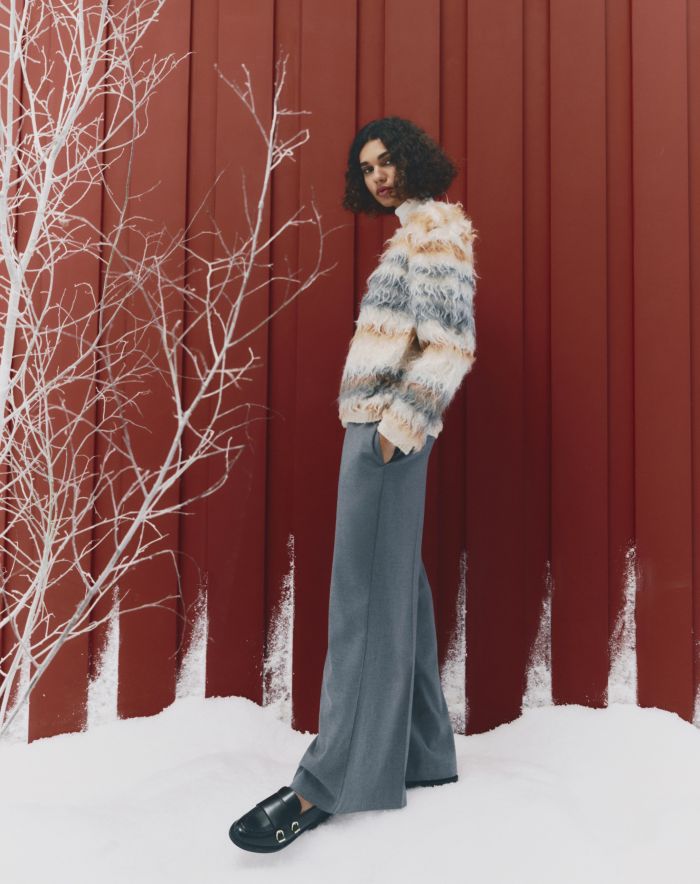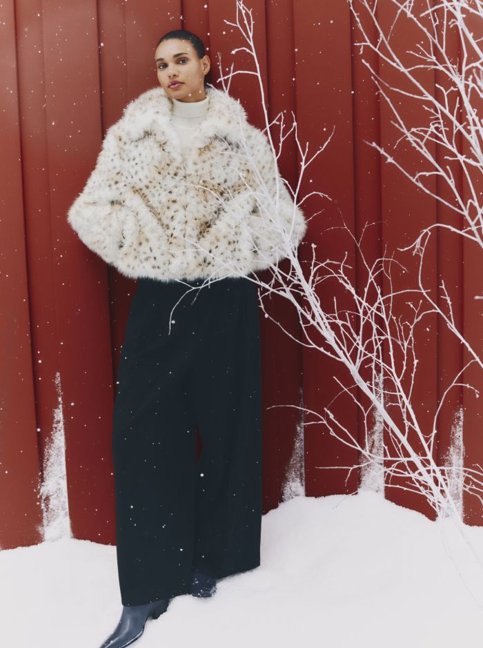 Ανάγλυφες πλέξεις και μαλακές επιφάνειες δημιουργούν κομμάτια που φοριούνται με φυσικότητα και λειτουργούν ως σταθερή βάση για διαφορετικούς συνδυασμούς. Οι γραμμές παραμένουν καθαρές, επιτρέποντας στα υλικά να ξεχωρίσουν. Τα πανωφόρια ακολουθούν την ίδια λογική. Faux fur jackets, κοντά μπουφάν και shearling υφές σχεδιάζονται με ισορροπημένες αναλογίες και διακριτική παρουσία. Πρόκειται για κομμάτια που συμπληρώνουν το σύνολο και προσφέρουν ευελιξία στο styling, από πρωινές έως πιο προσεγμένες εμφανίσεις.