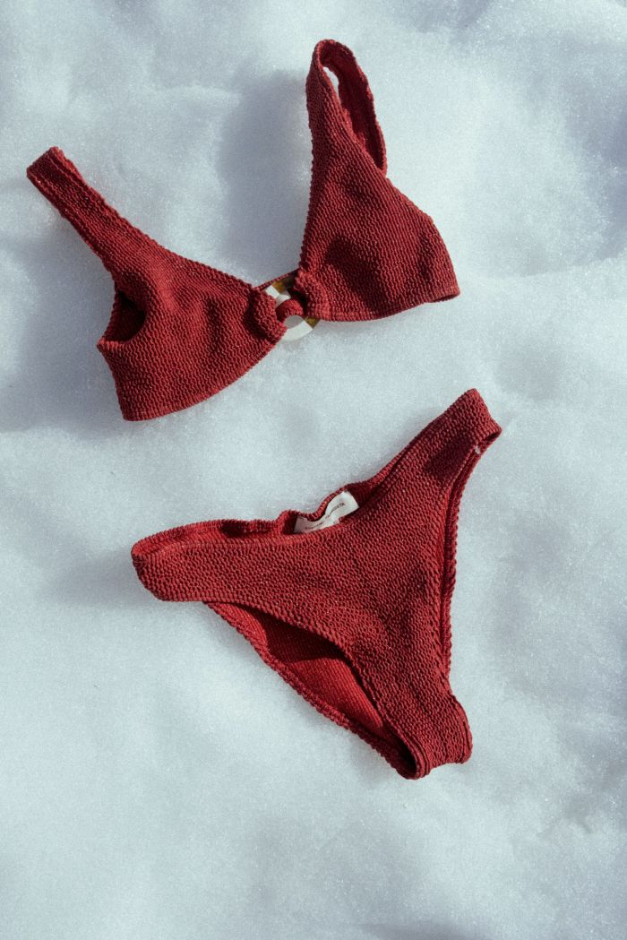 Εκεί, μερικά από τα νέα σχέδια, τα μπικίνι Prince, Bruna και Αli, καθώς και το ολόσωμο Josie (βλ. φωτογραφίες) φωτογραφίζονται έξω, στο εκτυφλωτικό λευκό του βουνού ή μέσα σε ένα ατμοσφαιρικό ρουστίκ καταφύγιο, σε μια αφήγηση χωρίς ένταση, που μοιάζει όμως σχεδόν κινηματογραφική, και γίνεται συναρπαστική χάρη και μόνο στις visual αντιθέσεις. Μια γυμνή σιλουέτα που φοράει μαγιό σε ένα φόντο που κυριαρχεί το ψυχρό χιόνι. Pied de poule, αλλά και αισθησιακό λεοπάρ, δίπλα σε ζεστό ξύλο και γούνα.