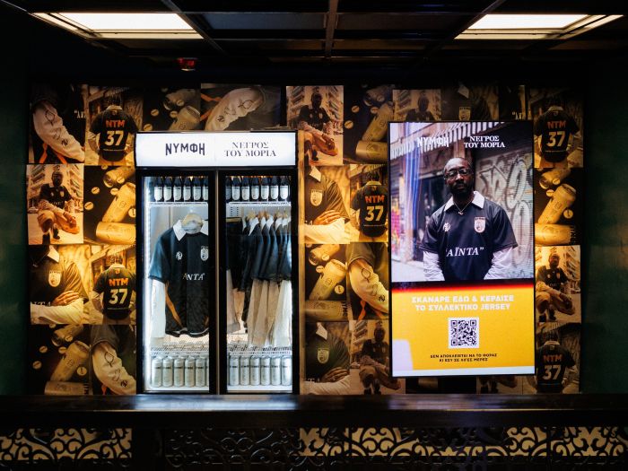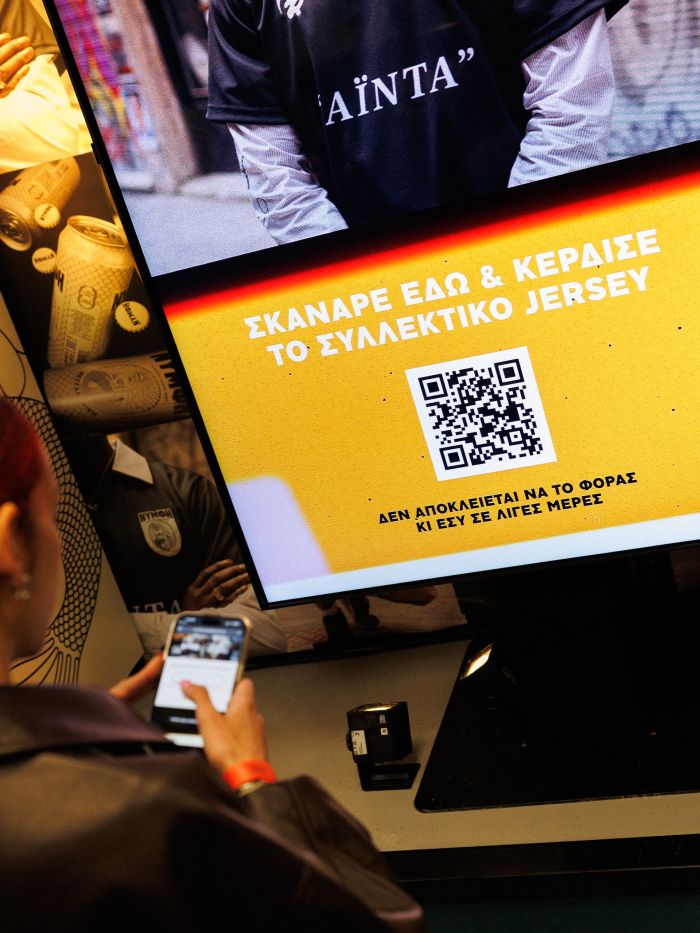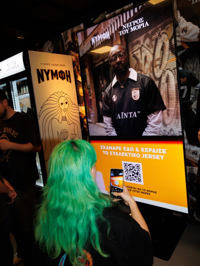 Από την είσοδο κιόλας, πριν καν μπεις στην αρένα, έπεφτες πάνω στο corner της ΝΥΜΦΗ και συναντούσες αυτό το cool collab. Το συλλεκτικό jersey, τοποθετημένο μέσα σε ένα ψυγείο-display, είχε κάτι από έκθεμα και κάτι από statement. Γύρω του, visuals και οθόνες που έτρεχαν την καμπάνια και τον διαγωνισμό για να κερδίσεις αυτό το συλλεκτικό μπλουζάκι έδιναν το στίγμα.