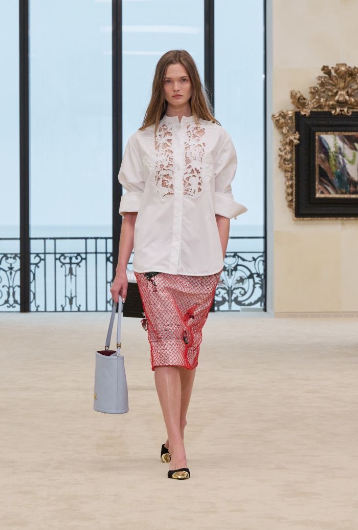 Ανάμεσα σε δύο κόσμους, την εκλεπτυσμένη ατμόσφαιρα του σαλονιού και τη χαλαρή ενέργεια της παραλίας, το πνεύμα του «Sous le salon la plage», αποτυπώθηκε σε σιλουέτες με δομή και ρευστότητα. Tweed σύνολα αποκτούν ελαφρότητα, ενώ αέρινα φορέματα και φούστες αγκαλιάζουν το σώμα με μια φυσική, ανεπιτήδευτη κίνηση.