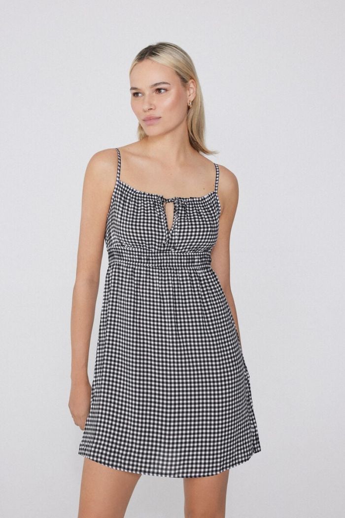 Είτε σε γραμμή A-line είτε πιο body-hugging, το κόκκινο καρό φόρεμα συνδυάζει ρετρό vibes με μοντέρνα κομψότητα. Διάλεξε ένα mini καλοκαιρινό φόρεμα ή midi όπως της Olivia και συνδύασέ το με λευκά πέδιλα ή σανδάλια.