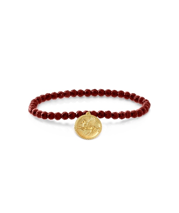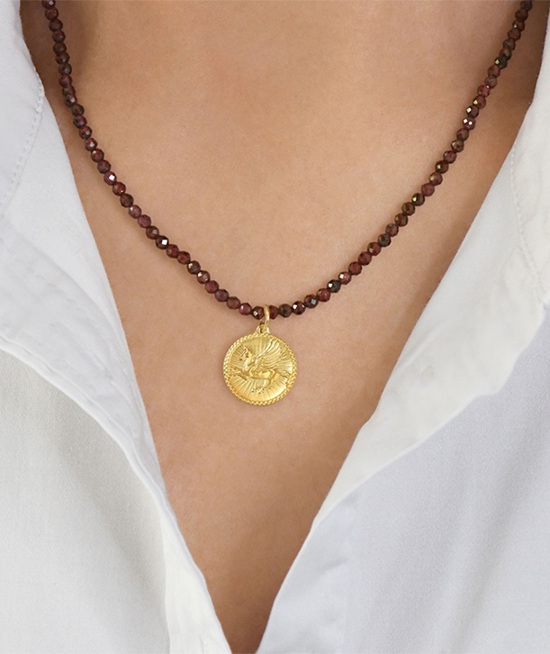 5. Το φυλαχτό «gouri» είναι μια παράδοση που καθιέρωσε η LALAoUNIS πριν από 50 χρόνια. Καλωσόρησε το νέο έτος με τον Πήγασο, το σύμβολο δύναμης, της προστασίας και της ουράνιας ελευθερίας. Το χρυσό φυλαχτό Pegasus '26 συνδυάζεται με χάντρες γρανάτη, δημιουργώντας ένα μοντέρνο φυλαχτό που συνδυάζει τη μυθολογική ενέργεια με πλούσια χρώματα.