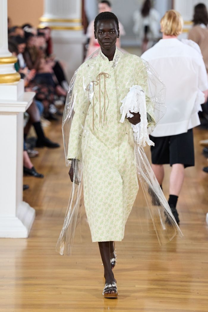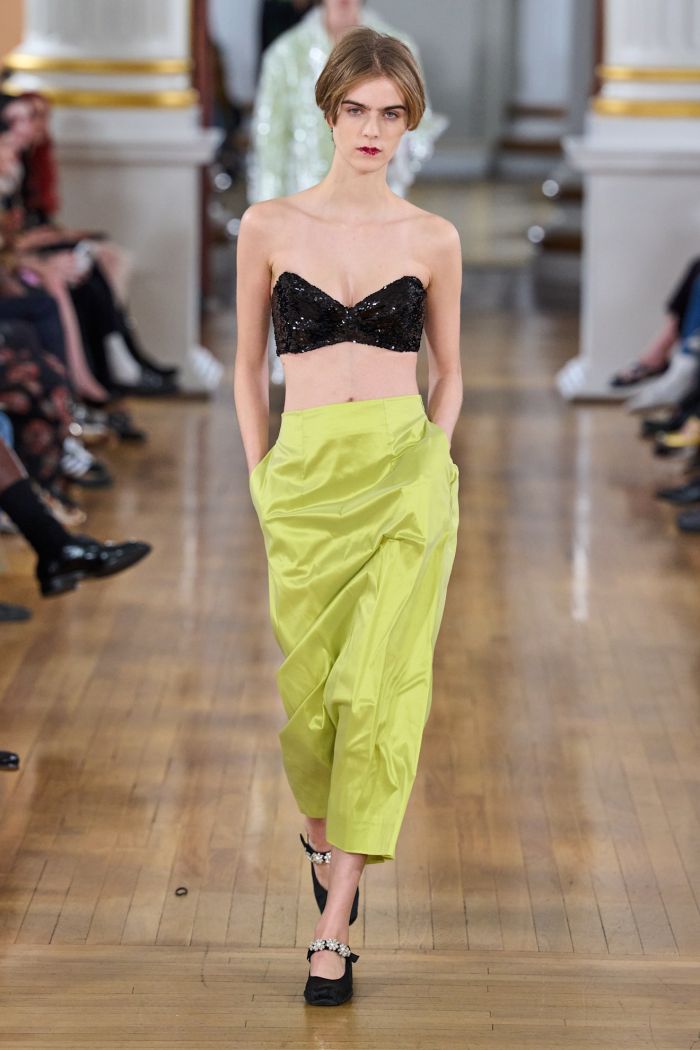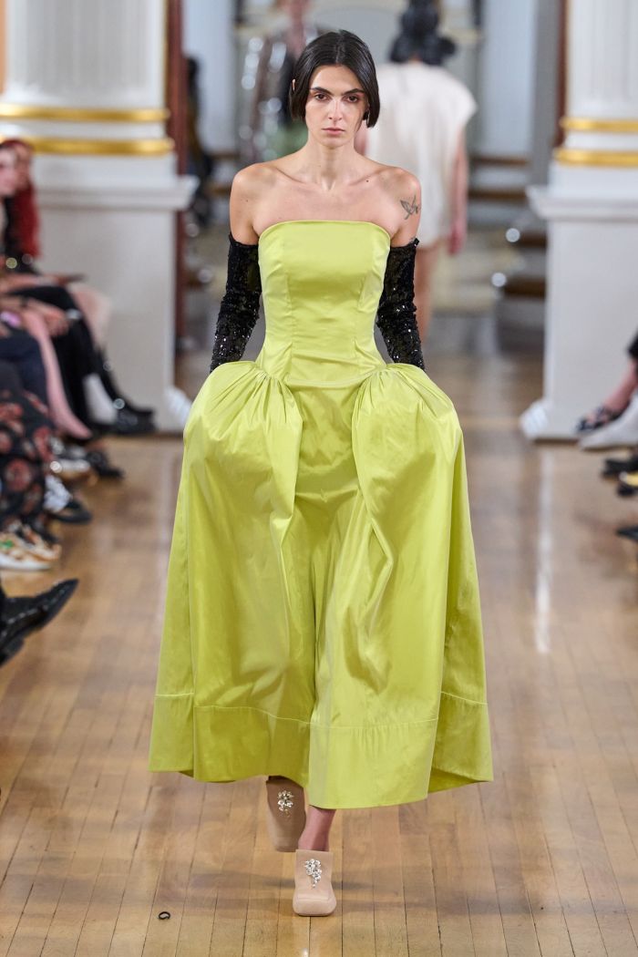 Η Simone Rocha συνεχίζει να πειραματίζεται με το απροσδόκητο, παρουσιάζοντας το lime ως το πιο τολμηρό χρώμα της χρονιάς. Έντονο, σχεδόν φουτουριστικό, το lime έρχεται σε αντίθεση με τις ρομαντικές γραμμές και τα διάφανα υλικά του οίκου, δημιουργώντας μια συναρπαστική ένταση. Είναι η απόχρωση που μιλά στη νέα γενιά της μόδας: τολμηρή, playful και απόλυτα statement.
