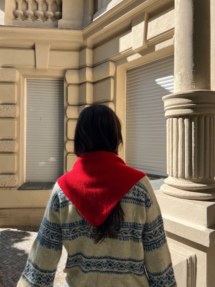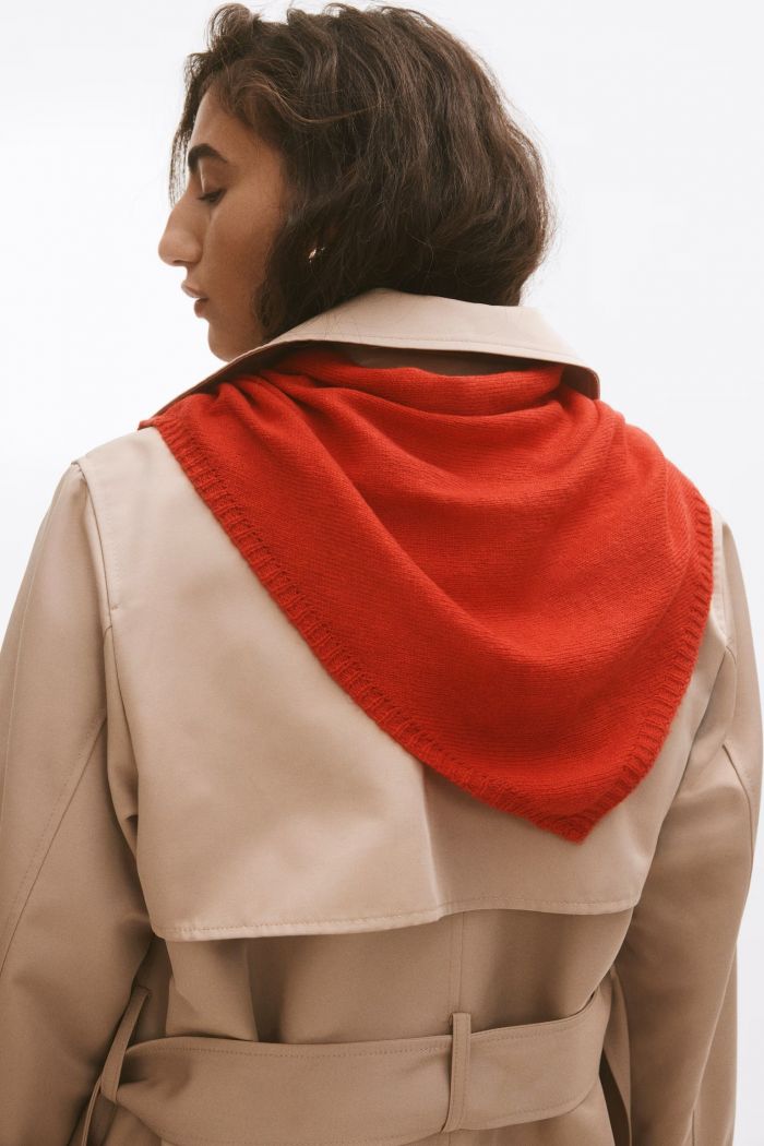 Το μυστικό της επιτυχίας του βρίσκεται στο σχήμα και στο υλικό. Το τρίγωνο επιτρέπει στο κασκόλ να κάθεται φυσικά πάνω στο σώμα, ενώ το πλεκτό ύφασμα προσθέτει υφή και αίσθηση ζεστασιάς. Δεν είναι υπερβολικά επίσημο, αλλά ούτε και τελείως casual κάτι που το κάνει ιδανικό για καθημερινή χρήση από το πρωί μέχρι το βράδυ.