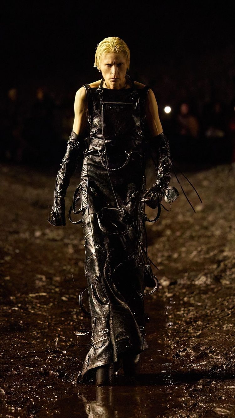 Πριν ακόμη δούμε την είσοδο των μοντέλων, το ίδιο το σκηνικό έδωσε την πρώτη γροθιά στο στομάχι: λάσπη, νερό και μεγάλοι κρατήρες που ανοίχτηκαν στο έδαφος έκαναν το runway να μοιάζει με ένα δυστοπικό τοπίο, που δυστυχώς με τις πρώτες καταστροφές λόγω της κλιματικής αλλαγής έγινε πραγματικό, για χώρες όπως το Πακιστάν. Και κάπου εκεί ο Kanye West/Ye άνοιξε το show, περπατώντας γρήγορα και επιθετικά στο «βρώμικο μονοπάτι» του, φορώντας ένα ολόμαυρο σύνολο, που έμοιαζε με στρατιωτική στολή, με ένα δερμάτινο παντελόνι και ένα tactical jacket με έντονες τσέπες. Πίσω του ακολούθησε μια «στρατιά» μοντέλων, με φανερά σημάδια μάχης στο πρόσωπο τους, αλλά και στα ίδια τα ρούχα, που αλλοιώθηκαν μέσω ειδικών επεξεργασιών.