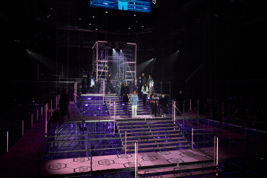Μία τεράστια κατασκευή με vivid pink catwalk και το μονόγραμμα του Philipp Plein, με πολλαπλά επίπεδα και extravagant φωτισμό ήταν το σκηνικό που μέσα σε λίγα λεπτά δέχτηκε τα μοντέλα στο runway. Την έναρξη της βραδιάς, όμως, έκανε το δημοφιλές rock band LA SAD, με τα τρία πιο fun αγόρια της ιταλικής μουσικής σκηνής να μπαίνουν στο catwalk και να ξεσηκώνουν το κοινό με το γνωστό τους στυλ. Δεν θα μπορούσε εξάλλου να ξεκινήσει διαφορετικά ένα show by Philipp Plein παρά μόνο με buzz και δυνατά vibes.
