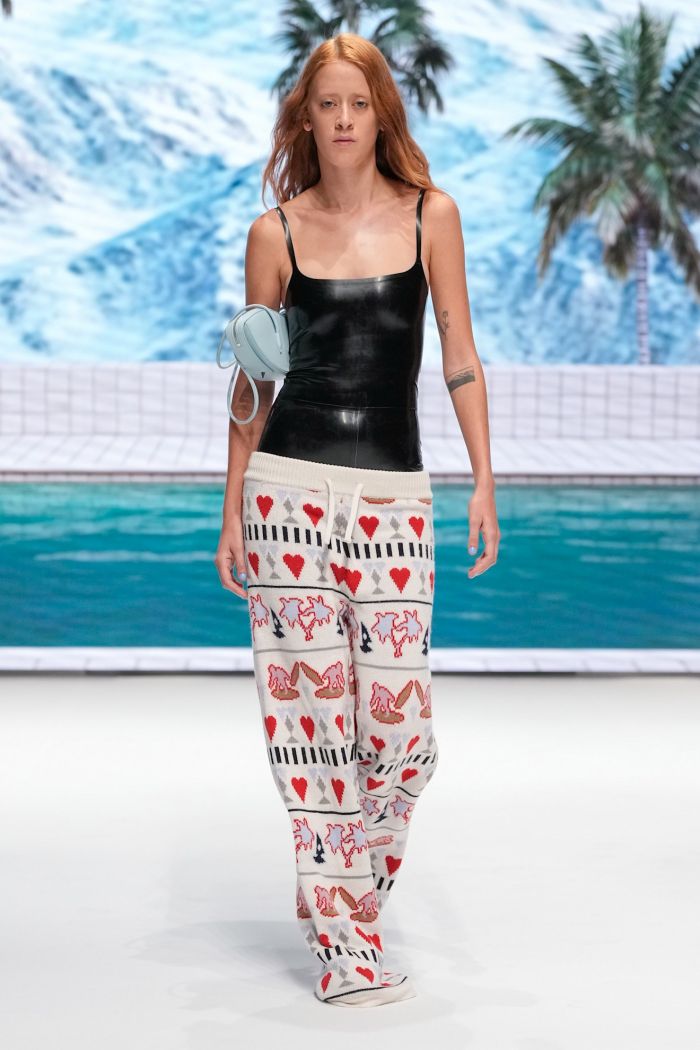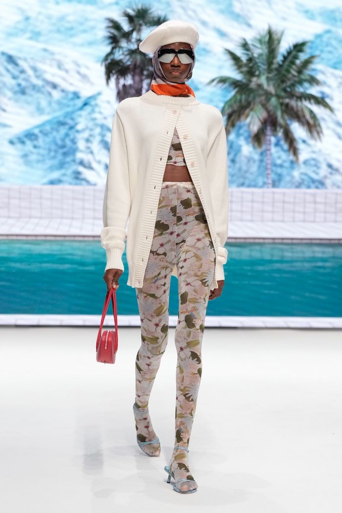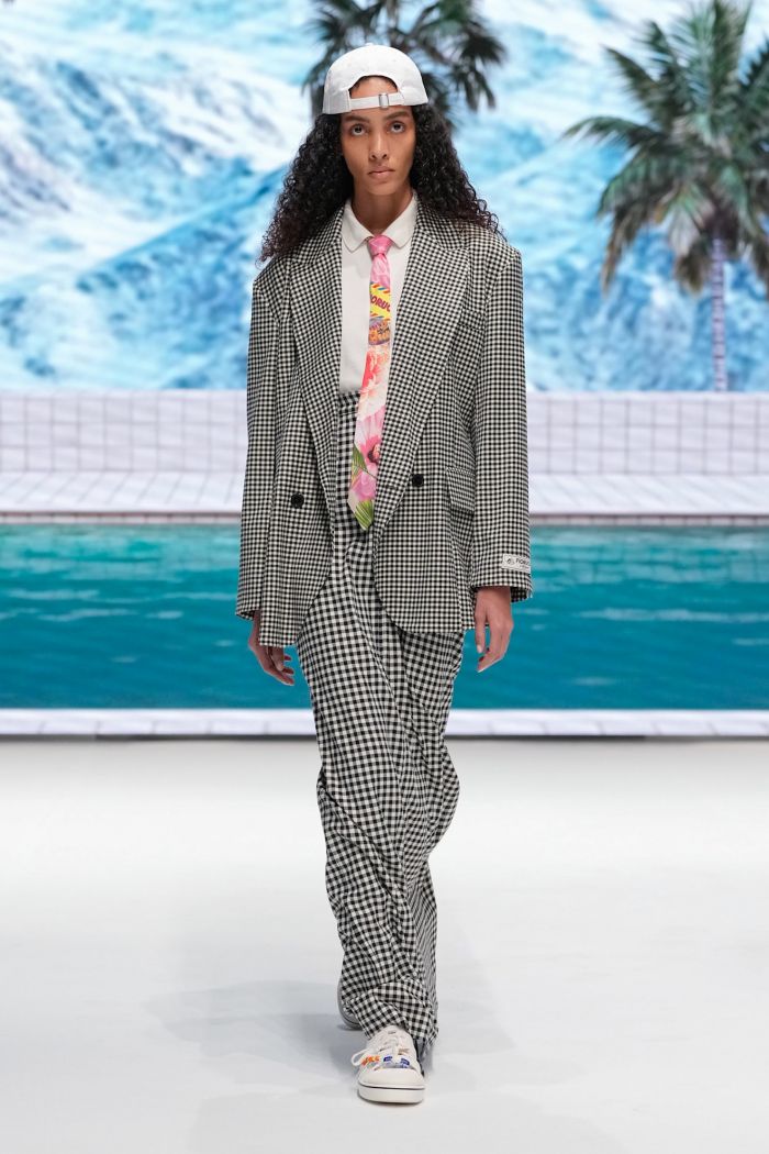 Το σκηνικό που στήθηκε για τη σημερινή μέρα έμοιαζε με μία μεγάλη πλαζ, με καρέκλες και ομπρέλες, όπου σύντομα κάθισαν δύο υπέροχες κυρίες που θα μπορούσαν να είναι η μαμά ή η γιαγιά σου, καθώς στις οθόνες το είδωλο των 80s Amanda Lear με ένα κόκκινο κοκτέιλ στο χέρι μας σύστηνε με τον τίτλο της νέας Fall/Winter 2025/2026 collection του οίκου: Beatitudo. Μία σουρεαλιστική εξέταση της ευτυχίας και της ελευθερίας, όπως αναφέρει το σημείωμα της creative director που βρήκαμε στα καθίσματά μας. Αυτή τη σεζόν το brand προσπάθησε να κάνει μία αντανάκλαση πάνω σε εκείνες τις στιγμές που είμαστε πραγματικά ήρεμοι, όταν η νεανικότητα και η ωριμότητα συμβιώνουν αρμονικά, όταν επιτρέπουμε στον εαυτό μας να είναι η πιο αληθινή εκδοχή του. Και κάπου εδώ μπήκε η σουρεαλιστική ματιά του οίκου, μεταφέροντας στο catwalk όλα τα παραπάνω στοιχεία.