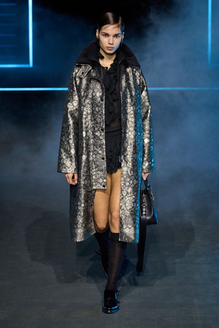 Μόνο που το Fall/Winter 2025/2026 show του Christian Dior ήταν λίγο διαφορετικό από όλα τα προηγούμενα. Το ίδιο το venue δεν κράτησε τη γνωστή του μορφή με τα τεράστια έργα κρεμασμένα στους τοίχους, αλλά δημιουργήθηκε ένα κεντρικό stage με μαύρο σκηνικό και φωτισμένα παγόβουνα ανάμεσα στα οποία περπατούσαν τα μοντέλα. Και τα looks που είδαμε στο catwalk ήταν μία ξεκάθαρη μίξη του παλιού και νέου Dior, της ιστορίας και του παρόντος.