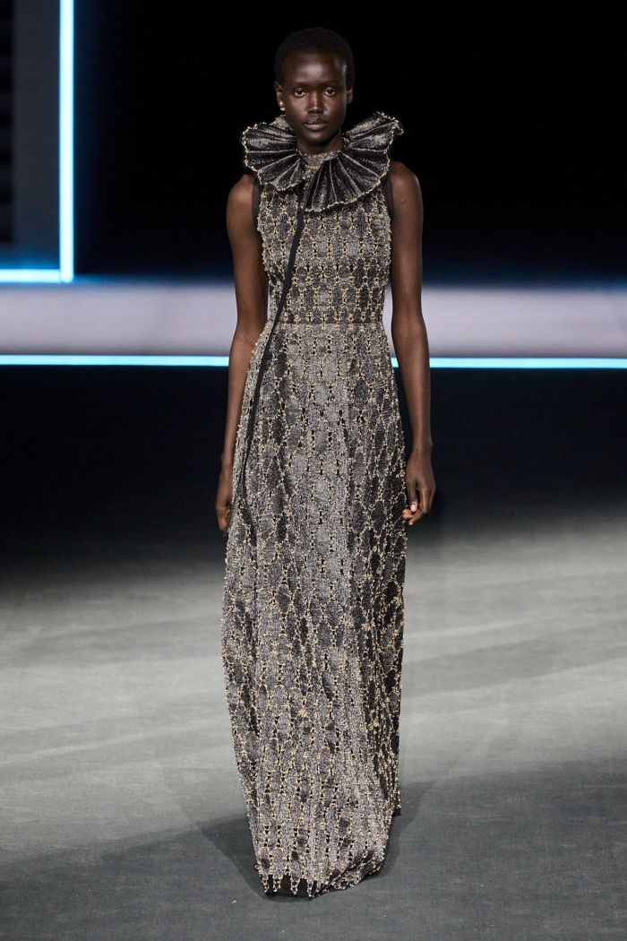 Σημείο αναφοράς της έμπνευσης της Maria Grazia Chiuri ήταν η μόδα της ελισαβετιανής εποχής και το μεταμορφωτικό μυθιστόρημα της Virginia Woolf «Orlando». Άλλες δύο σπουδαίες γυναίκες στο καρνέ της Chiuri, λοιπόν. Για πολλούς οι όγκοι και τα εκατοντάδες βολάν αλλά και τα κολάρα που είδαμε στα 79 looks που παρουσιάστηκαν χθες, ήταν ίσως αρκετά πληθωρικά με βάση τα όσα είδαμε τελευταία από τον οίκο Dior, αλλά τα bustiers και τα shapes εμπνευσμένα από τα κρινολίνα της εποχής ήταν εξαιρετικά ενδιαφέροντα σε αυτό το δημιουργικό mix and match με τη σύγχρονη γκαρνταρόμπα μία γυναίκας, που λατρεύει το μαύρο της παντελόνι, τα πουκάμισα και τα πανωφόρια.