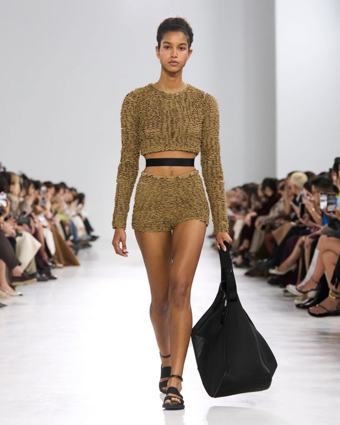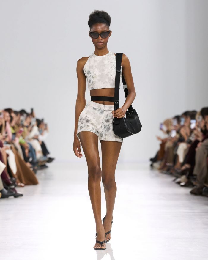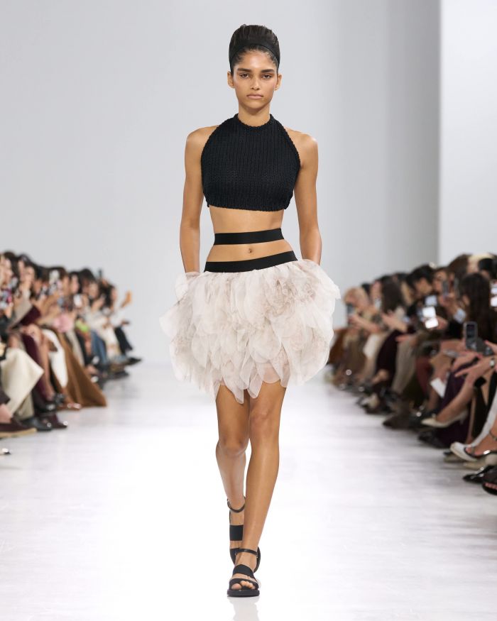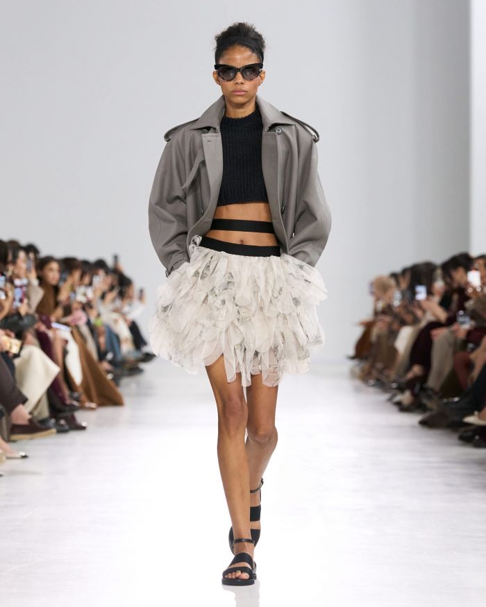 Παρόλο που η συλλογή έχει μια ονειρική, σχεδόν εξωπραγματική αύρα, παραμένει απόλυτα σύγχρονη. Μαύρες ζώνες, λουριά, πρακτικά αξεσουάρ και κομμάτια με δυναμικό tailoring κρατούν τα looks στη γη – και στο τώρα.