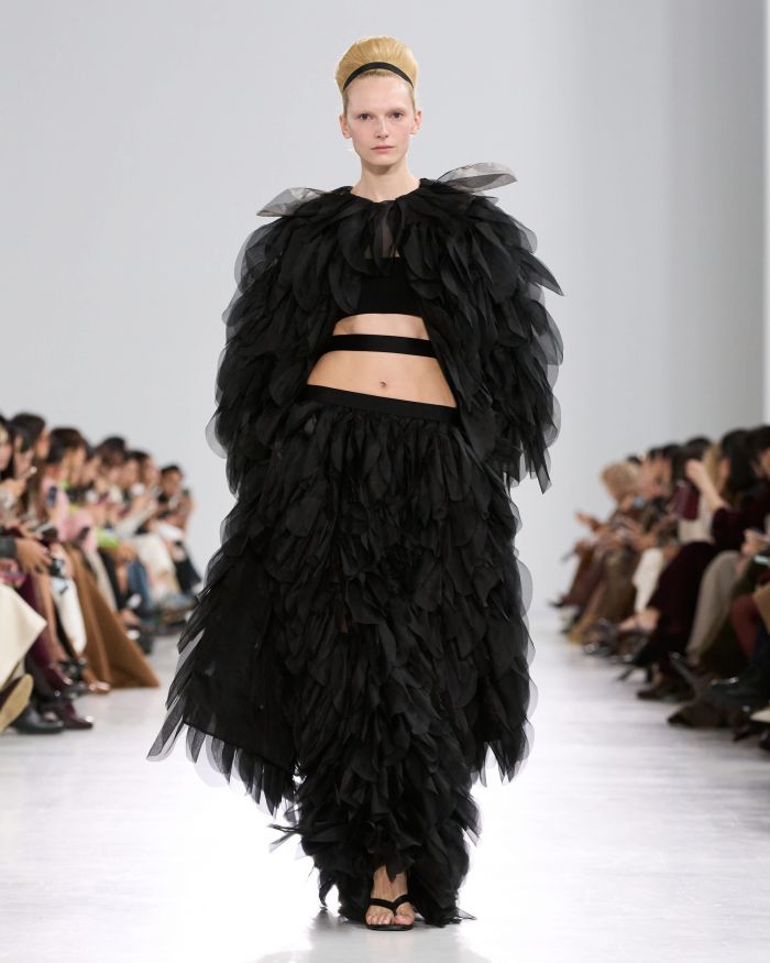 Ένα trench coat με λεπτομέρειες στους ώμους θυμίζει φύλλα ή πούπουλα κάποιου φανταστικού πουλιού. Μια αυστηρή φούστα αποκτά εντυπωσιακή κίνηση χάρη σε ένα ανάλαφρο, σχεδόν αιθέριο, διακοσμητικό. Φούστες από οργάντζα είναι φτιαγμένες από εκατοντάδες μικρά, διπλωμένα κομμάτια που θυμίζουν πέταλα ή θαλάσσια φυτά. Τα χρώματα είναι απαλότατα, σχεδόν άυλα - εμπνευσμένα από τη βασίλισσα του ροκοκό στυλ.