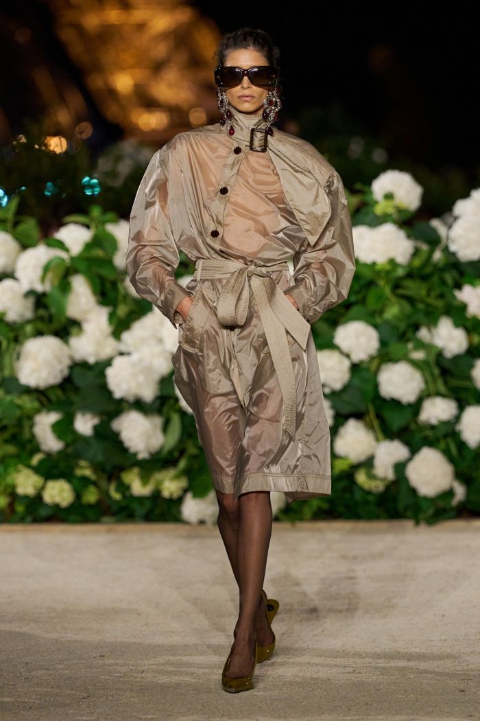 Το runway πλημμύρισε από baby doll φορέματα σε δαντελένιες υφές, σε τόνους του ροδακινί, του μαύρου και του μωβ, που συνδυάστηκαν με oversized trench coats και glossy παλτά, παραπέμποντας σε έναν bold ρομαντισμό. Η παρουσία της Bella Hadid στο show, με ένα πορτοκαλί σύνολο που θύμιζε αθλητικό windbreaker, απέδειξε πως ακόμα και τα πιο «ανάλαφρα» υλικά μπορούν να αποκτήσουν red carpet υπόσταση όταν φέρουν την υπογραφή του Vaccarello.