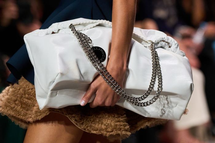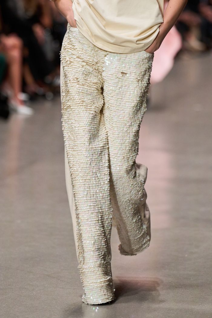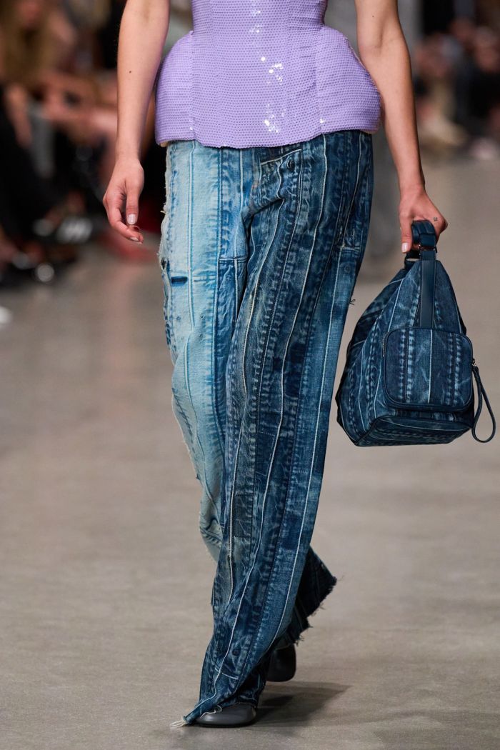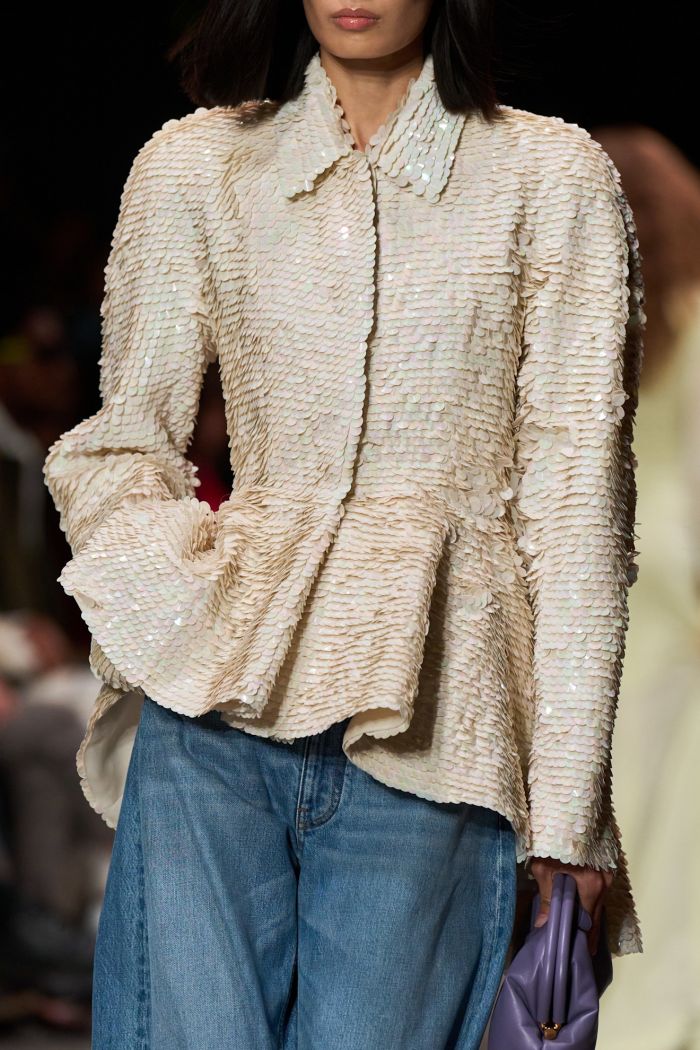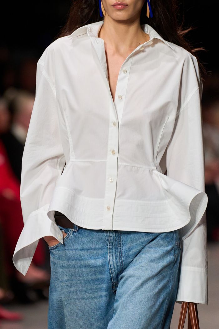 Η πασαρέλα γέμισε με 50 εμφανίσεις που ενσάρκωναν όλα τα βασικά συστατικά της υπογραφής της σχεδιάστριας: έντονοι ώμοι σε ραφές ποπλίν, oversized shirts, πούλιες με glam αναφορές και τζιν patchwork που ταξίδευαν πίσω στις δεκαετίες του '70 και '90. Τα διπλά πουκάμισα και τα φαρδιά τζιν προσέφεραν έναν φρέσκο διάλογο γύρω από την καθημερινή ένδυση, ενώ τα κομμένα τοπ και τα statement παλτά αποκάλυπταν μια πιο τολμηρή πλευρά της McCartney.