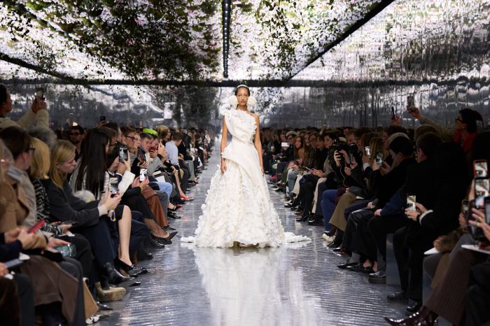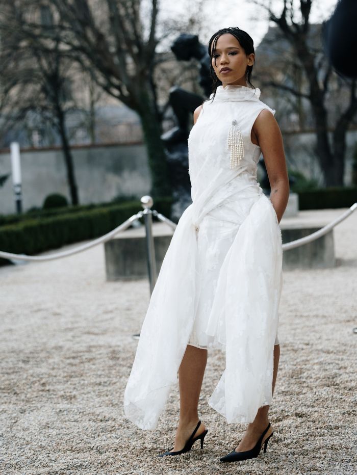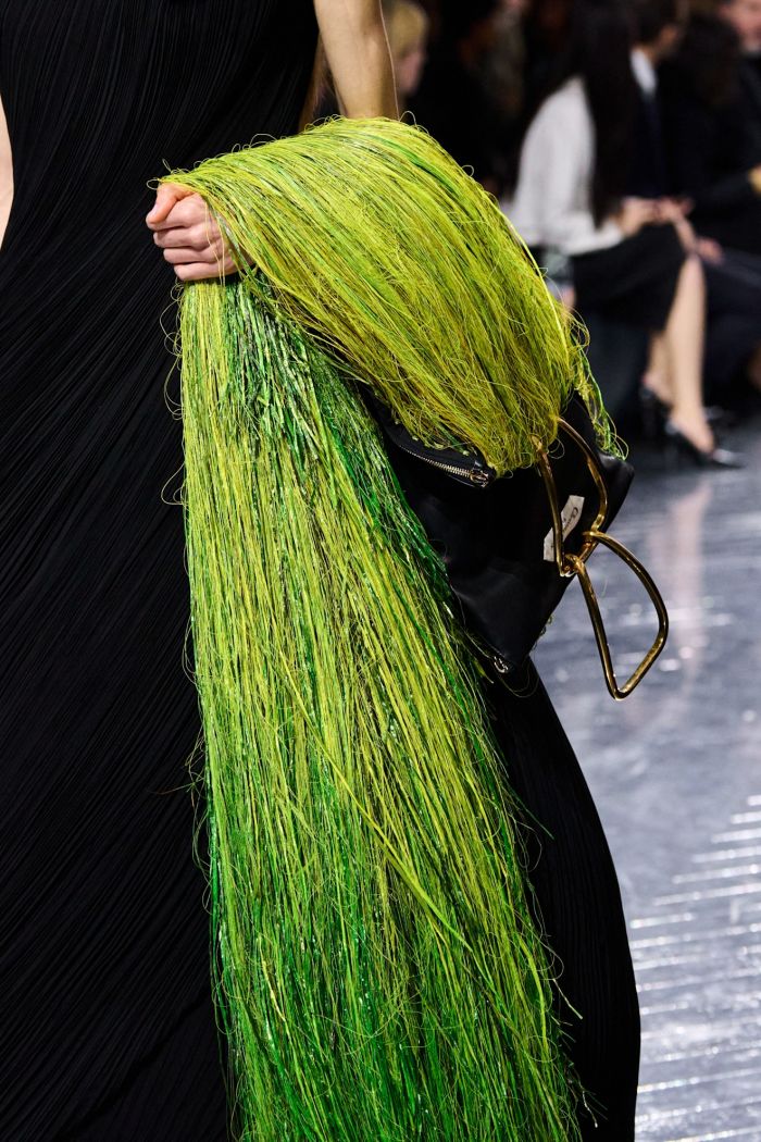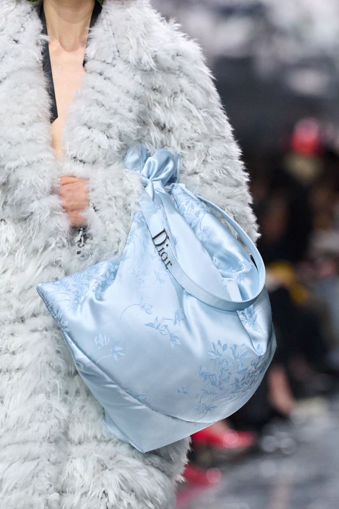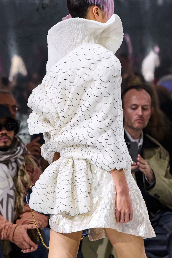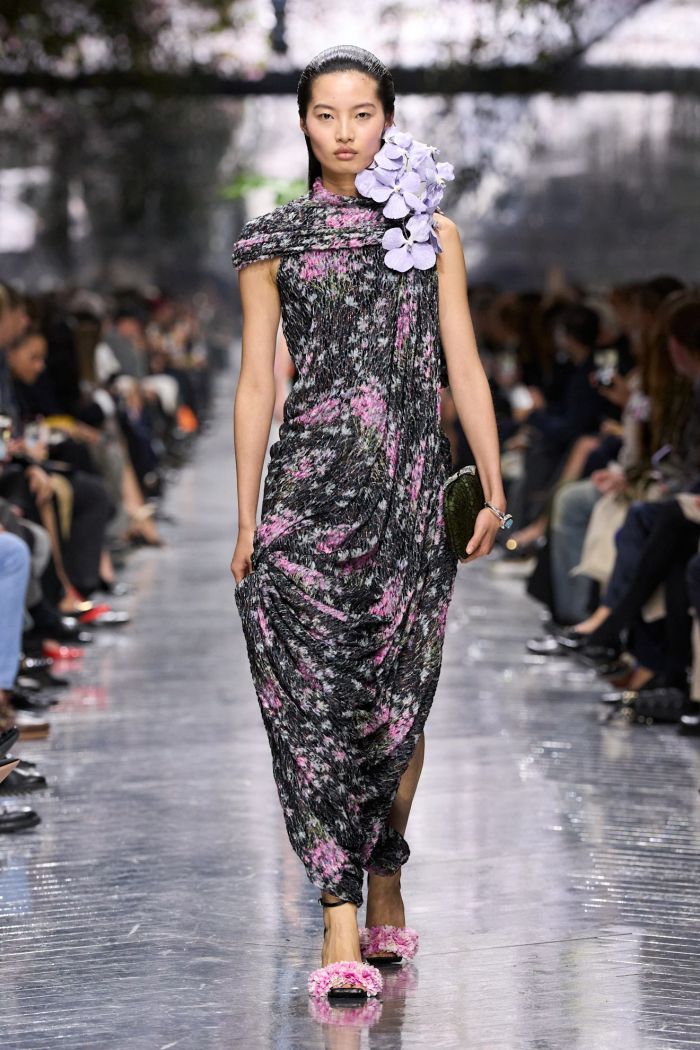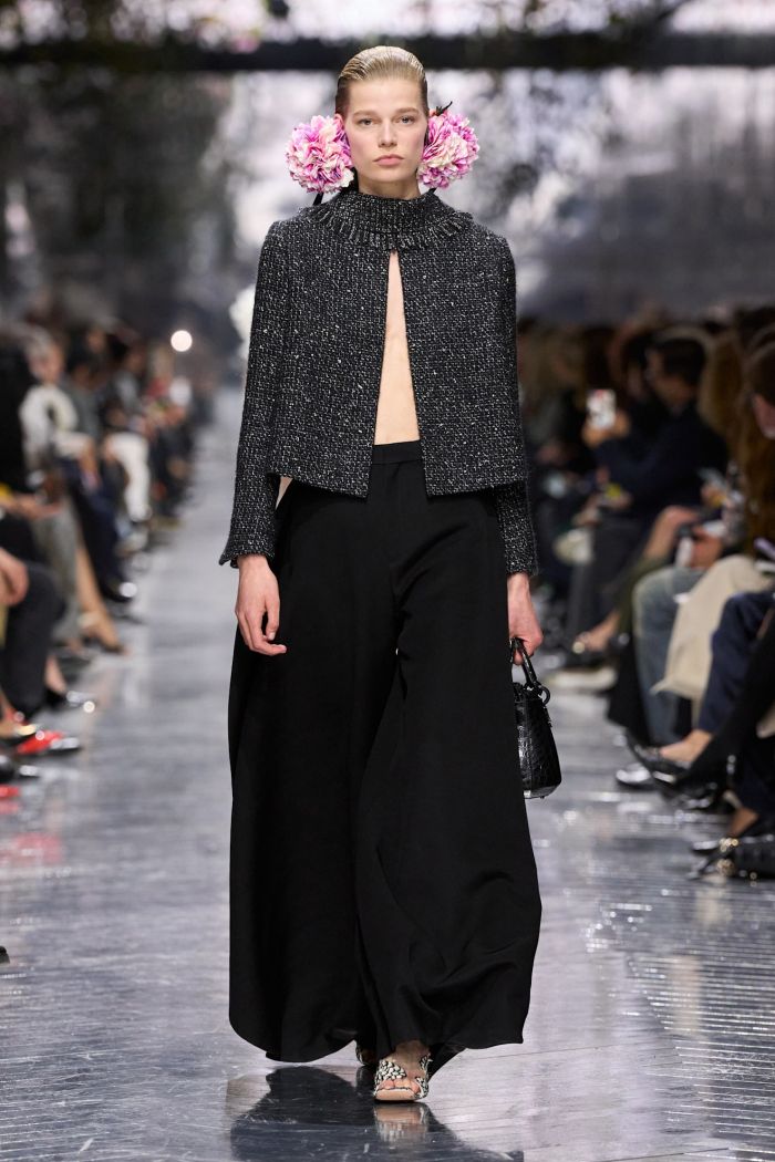 Οι γραμμές ρέουν απαλά πάνω σε δομημένα σχήματα ή αγκαλιάζουν το σώμα με φυσικότητα, μεγεθύνοντας τις καμπύλες του σώματος. Αναδύεται μια νέα γραμματική φόρμας που διευρύνει τη γλώσσα του Dior, ενώ ταυτόχρονα συνομιλεί με τα θεμέλιά του.