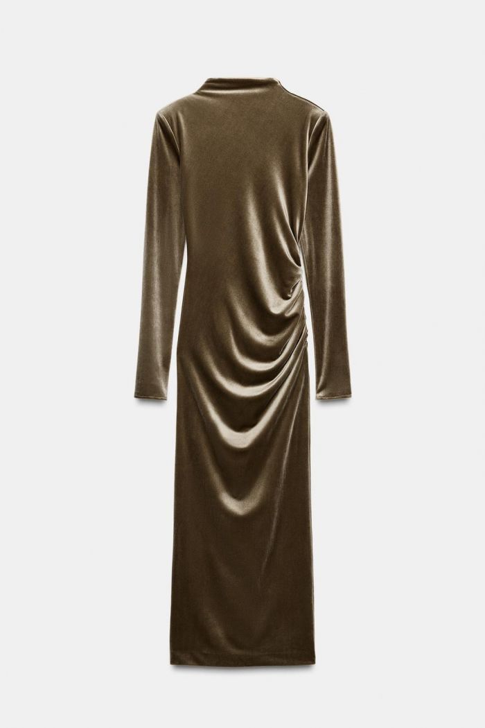 Για πιο elegant εμφανίσεις, το midi φόρεμα σε γκρι ανοιχτό βελούδο είναι μια διαχρονική επιλογή. Ο όρθιος γιακάς, τα μακριά μανίκια με βάτες και η πλαινή ντραπέ λεπτομέρεια δημιουργούν ένα αποτέλεσμα που θυμίζει red carpet. Το βαθύ άνοιγμα στην πλάτη και το άνοιγμα στο κάτω μέρος εξισορροπούν το συντηρητικό πάνω μέρος με μια διακριτική δόση θηλυκότητας.