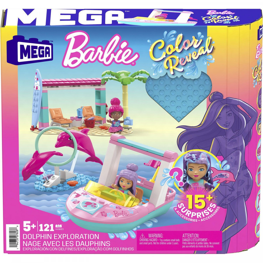 Σετ κατασκευών MEGA Barbie Color Reveal, που κρύβει διασκεδαστικές εκπλήξεις για να τις αποκαλύψεις. Η εμφάνιση κάθε μικρής κούκλας είναι ένα μυστήριο. Ξεκίνησε ανοίγοντας το δοχείο σε σχήμα καρδιάς και βρες τα 2 σακουλάκια με τις εκπλήξεις. Στο εσωτερικό θα βρεις 10 εκπλήξεις, όπως μία μικρή κούκλα Color Reveal. Γέμισε το δοχείο με ζεστό νερό, τοποθέτησε μέσα την κούκλα που βρήκες και στριφογύρισέ την για να αποκαλύψεις την εμφάνισή της. Μετά, βύθισε το σφουγγάρι σε παγωμένο νερό για να μεταμορφώσεις την εμφάνισή της. Τοποθέτησε τα υπόλοιπα αντικείμενα στο ζεστό νερό και αποκάλυψε περισσότερες εκπλήξεις. Φτιάξε το σκάφος με τη βάση Color Reveal, για να ανακαλύψεις ψάρια και τοποθέτησε τις δύο μικρές κούκλες μέσα για να ξεκινήσεις την εξερεύνηση. Έπειτα, φτιάξε τους κρίκους για να μάθεις κόλπα στα δελφίνια. Όταν έρθει η ώρα να χαλάρωσε, φτιάξε την καλύβα στην παραλία και διασκέδασε στον ήλιο.