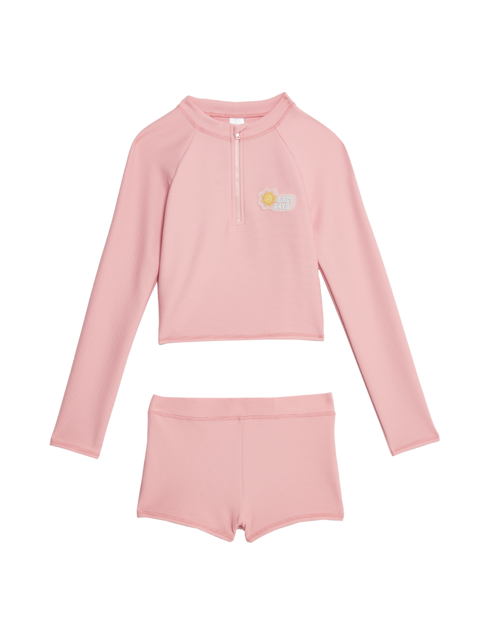 Δίχρωμο σετ μαγιό με μακρύ μανίκι και ψηλόμεσο σορτς, σε dusty ροζ απόχρωση, με σύνθημα "Easy Days" – μια πρόταση με anti-UV προστασία, ιδανική για τις ώρες κάτω από τον ήλιο.