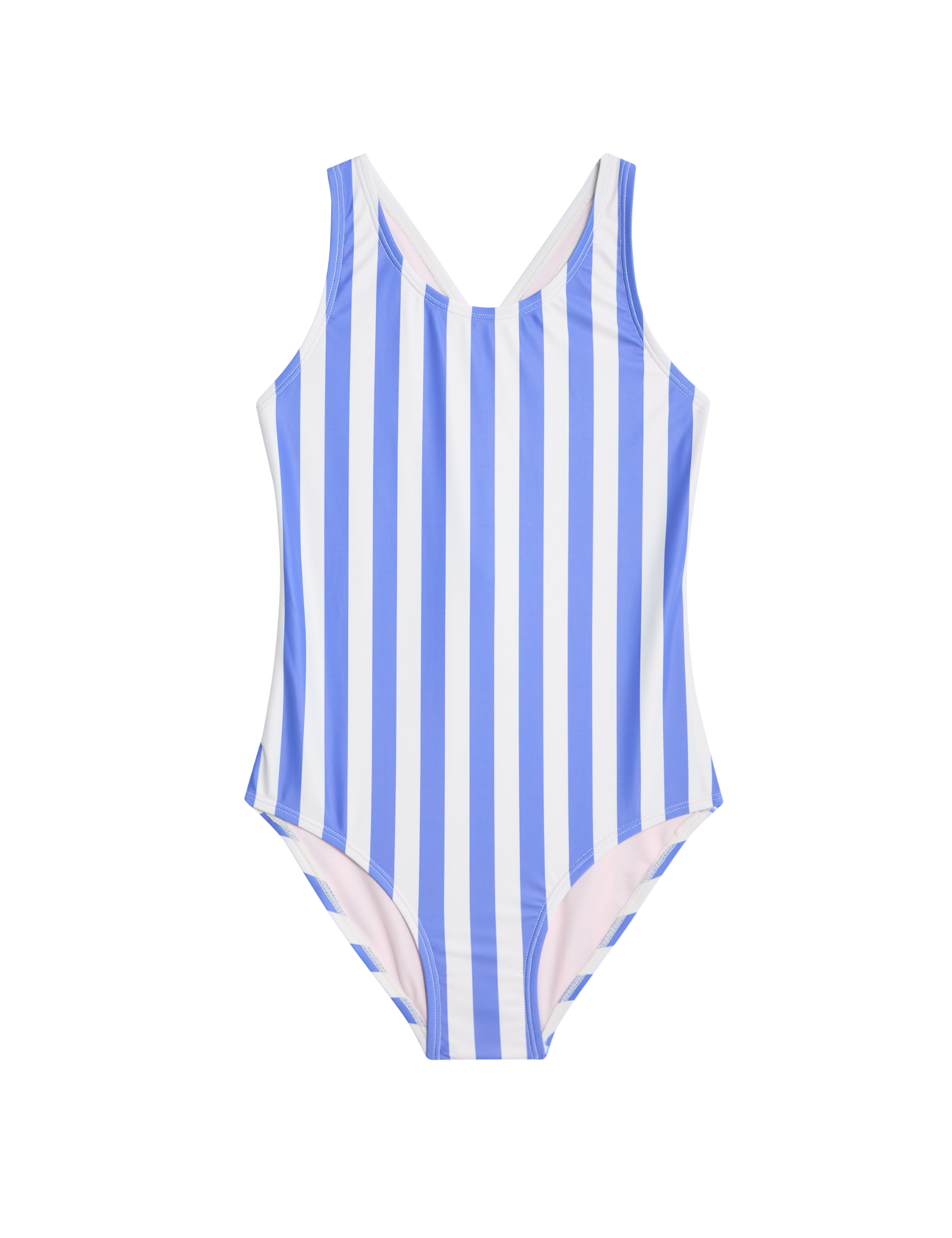 Ολόσωμο μαγιό σε κλασική ρίγα, μπλε και λευκό, που αποπνέει ρετρό φινέτσα και διαχρονικό στιλ για κορίτσια.