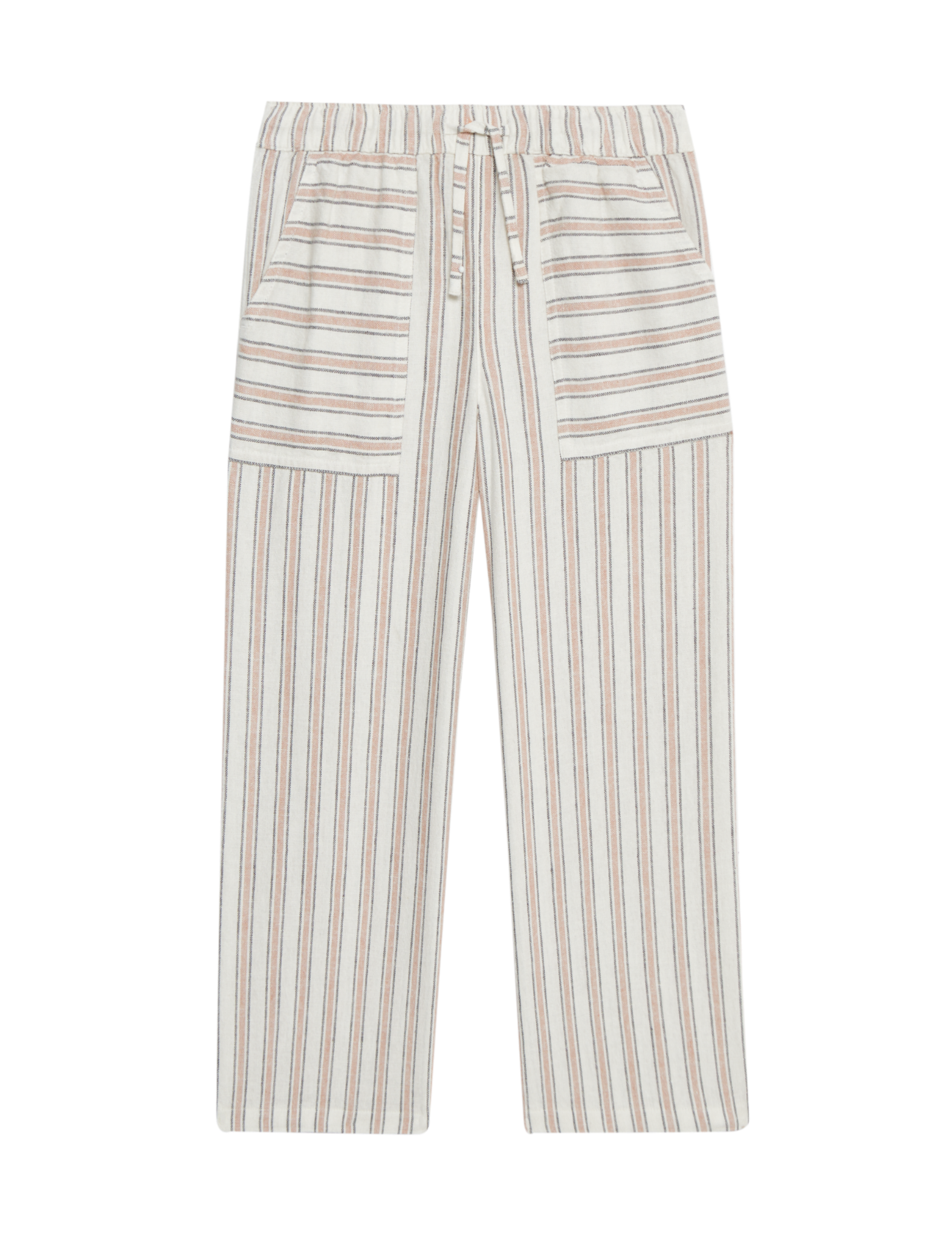 Αέρινο παντελόνι με ελαστική μέση και μεγάλες τσέπες, σε μπεζ τόνο με λεπτές ρίγες. Ένα ευέλικτο κομμάτι για κάθε καλοκαιρινή εμφάνιση.