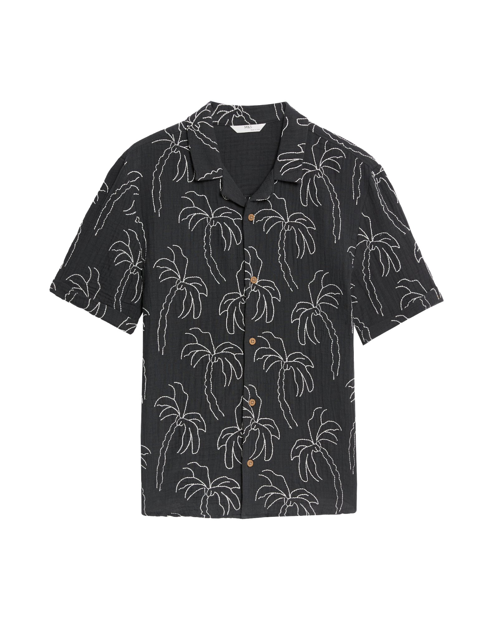 Πουκάμισο με μοτίβο φοίνικες, σε ανάγλυφη εκτύπωση πάνω σε μαύρο βαμβακερό ύφασμα. Το απόλυτο summer classic για κομψές αγορίστικες εμφανίσεις.
