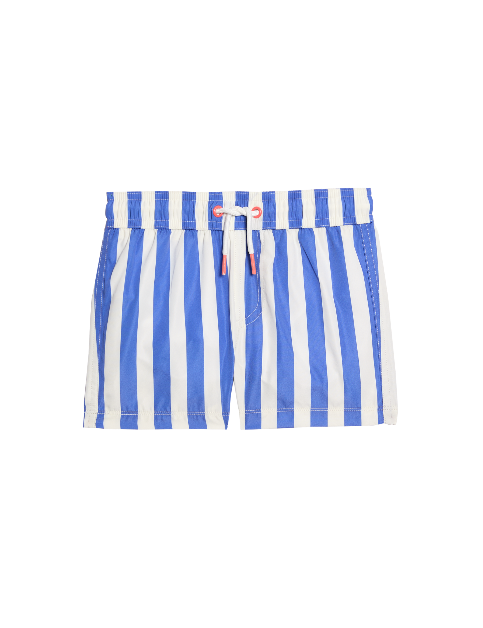 Μαγιό με κάθετες μπλε-λευκές ρίγες και κορδόνι στη μέση. Η απλότητα που κερδίζει, με κλασική γραμμή και μοντέρνο ύφος.