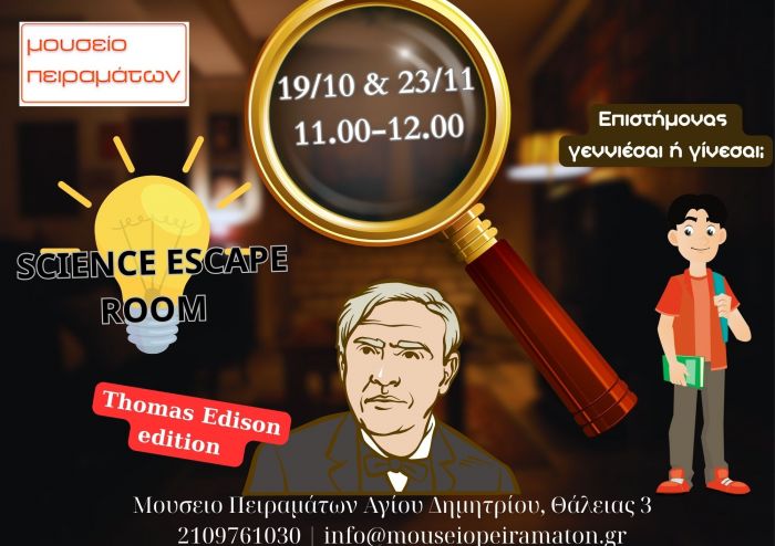 Τα τμήματα Junior Science απευθύνονται σε πολύ μικρούς επιστήμονες 4-6 ετών, μαζί με τους γονείς τους, ενώ τα υπόλοιπα προγράμματα σε παιδιά 7 ετών και άνω, ανάλογα με τη θεματολογία τους. Για τους πιο μεγάλους μας επιστήμονες 8-12 ετών το Μουσείο Πειραμάτων Αγίου Δημητρίου διαθέτει το πρώτο Science Escape Room με πειράματα Φυσικής, Χημείας και Βιολογίας. Το σενάριο μυστηρίου και γνώσης “Thomas Edison Edition”, μέσα στο ρεαλιστικό σκηνικό του σπιτιού του μικρού Θωμά, μάς καλεί να απαντήσουμε στο κρίσιμο ερώτημα: «Τελικά, επιστήμονας γεννιέσαι ή γίνεσαι;».