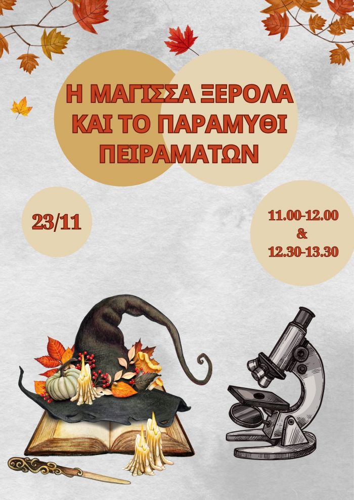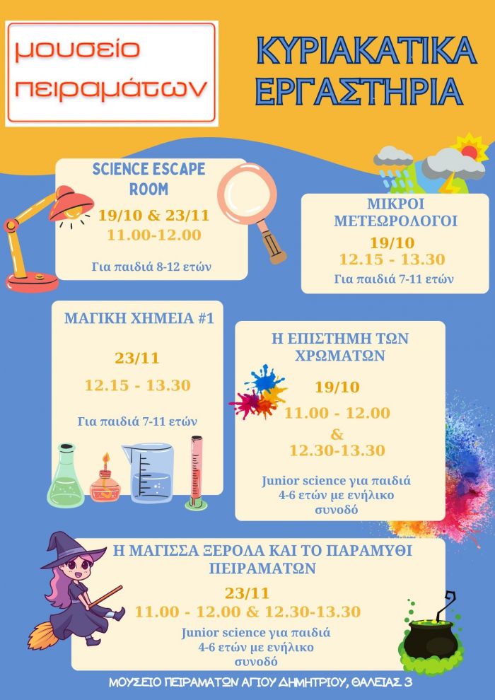 Τις φθινοπωρινές Κυριακές του Οκτωβρίου και του Νοεμβρίου στο Μουσείο Πειραμάτων οι πολύ μικροί επιστήμονες θα κάνουν «πολύχρωμα» πειράματα και θα διώξουν τη μάγισσα Ξερόλα με τη βοήθεια της Ντίας Χημείας, της Φίφης Φυσικής και της Μπιάς Βιολογίας, ενώ οι λίγο μεγαλύτεροι επιστήμονες θα μάθουν τα πάντα για την ατμόσφαιρα και τα καιρικά φαινόμενα και θα κάνουν αληθινά πειράματα Χημείας.