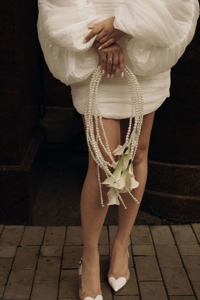Ένα από τα πιο εντυπωσιακά παραδείγματα είναι το clutch με άνθη. Σκέψου το iconic Cult Gaia clutch, γεμάτο φρέσκα λουλούδια, να γίνεται το πιο fashionable bridal statement. Εξίσου κομψή επιλογή είναι οι τσάντες με πέρλες, μικρά pearl pouches γεμάτα λευκά άνθη, που συνδυάζουν την κλασική κομψότητα με μια παιχνιδιάρικη νότα.