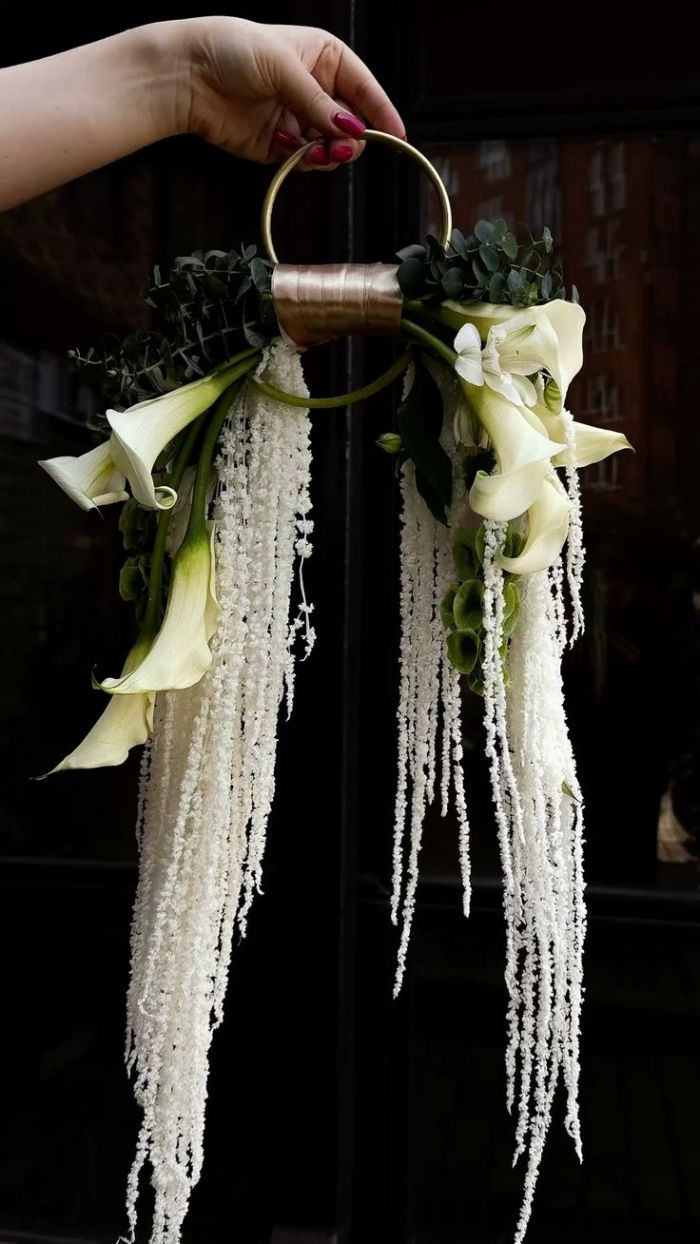 Για πιο μινιμαλιστική διάθεση, οι συνθέσεις με handles είναι μια υπέροχη πρόταση: κάλλες ή τριαντάφυλλα δεμένα σε λαβή, με κορδέλες και διακριτικά κοσμήματα, ταιριάζουν ιδανικά σε νύφες που αγαπούν το λιτό αλλά εντυπωσιακό. Και φυσικά, για όσες θέλουν κάτι πραγματικά «out of the box», υπάρχουν οι avant-garde δημιουργίες, γλυπτικές συνθέσεις με κορδέλες, πέρλες και μεταλλικές λεπτομέρειες που θυμίζουν μικρά έργα τέχνης.