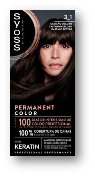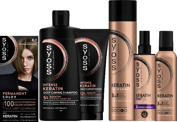 - Χρώμα. Intensified. Τα επαγγελματικά προϊόντα βαφής μαλλιών του Syoss έχουν ανανεωθεί ώστε να προσφέρουν έως και 100 ημέρες έντασης χρώματος και έως και 100% κάλυψη λευκών, χάρη στην προηγμένη φόρμουλα της color cream. Επιπλέον, η προσθήκη κερατίνης συμβάλλει στην ενδυνάμωση της τρίχας μέσω της βελτιωμένης φροντίδας μετά τη βαφή, που πλέον συνοδεύεται και από τη μάσκα βαθιάς περιποίησης με κερατίνη για πιο δυνατά μαλλιά.