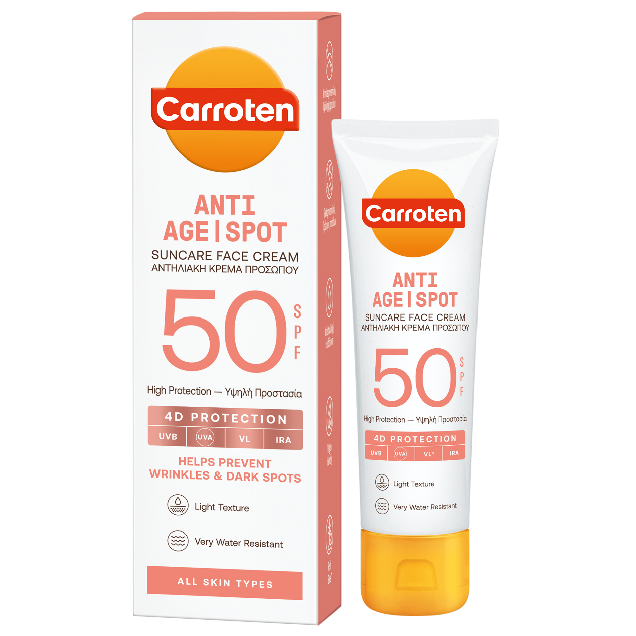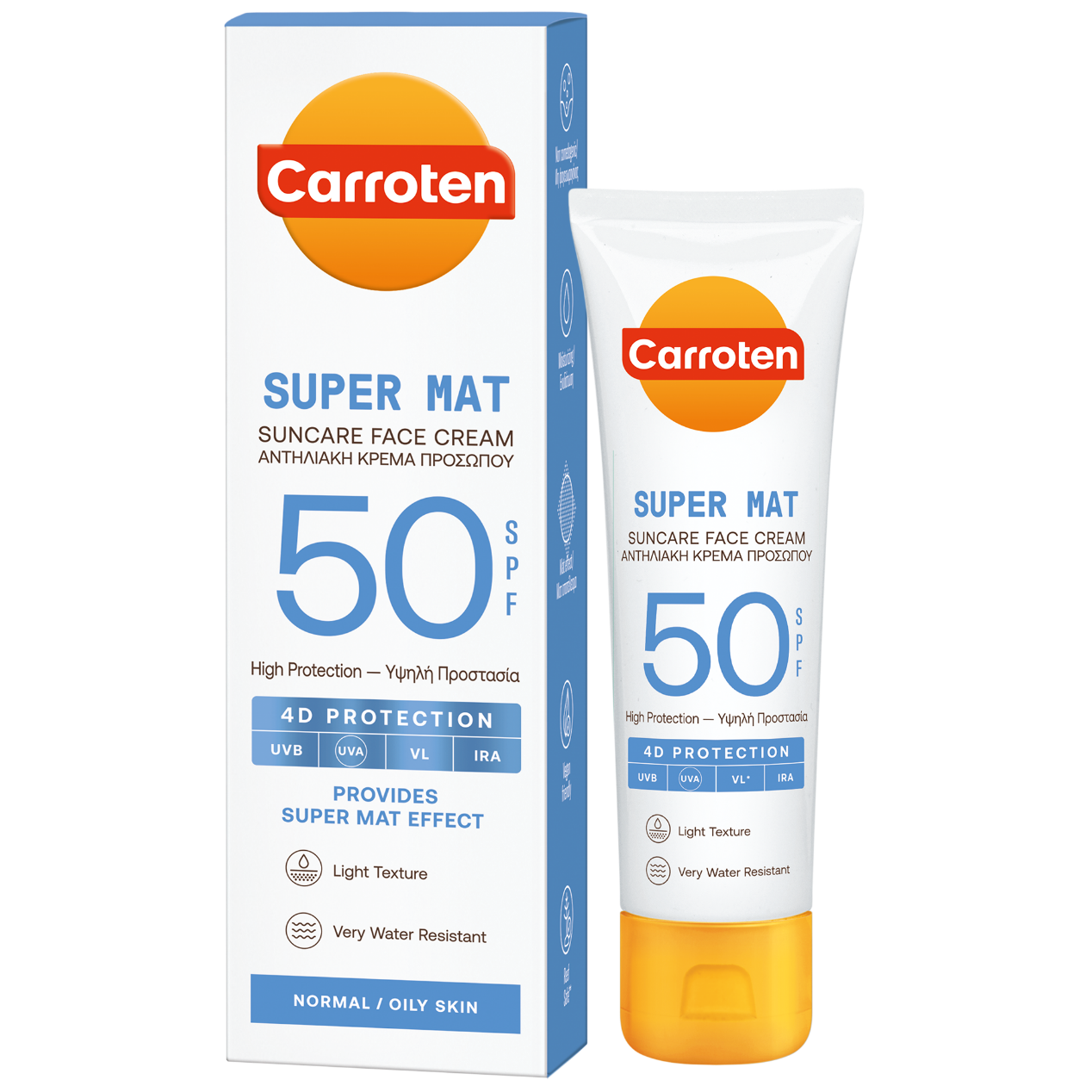 Οι αντηλιακές κρέμες προσώπου του Carroten μας προσφέρουν όλα όσα χρειαζόμαστε: Προστατεύουν από τις ακτίνες UVA, υπεύθυνες για τη γήρανση της επιδερμίδας και τις μακροπρόθεσμες παθήσεις, αλλά και από τις UVB, υπεύθυνες για το μαύρισμα και τα εγκαύματα. Επίσης, φιλτράρουν το ορατό φως VL, που επηρεάζει τη μελανίνη στο δέρμα και προστατεύουν από την IRA, την υπέρυθρη ακτινοβολία που προκαλεί οξειδωτικές βλάβες.