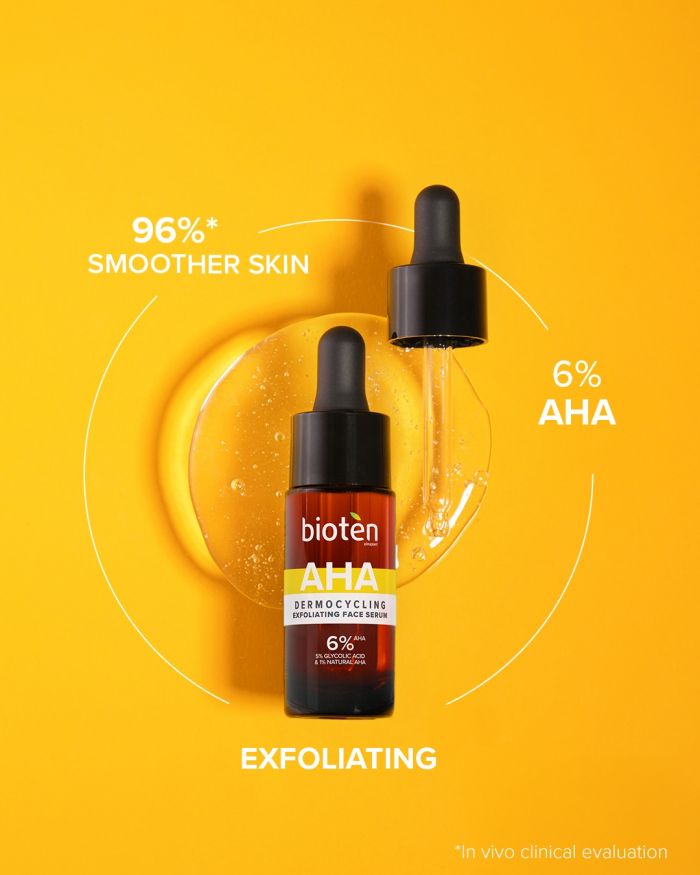 - bioten AHA Exfoliating Face Serum με 6% AHA (5% γλυκολικό οξύ & 1% φυσικό AHA): Απομακρύνει τα νεκρά κύτταρα, βελτιώνει την υφή και προσφέρει πιο ομοιόμορφο τόνο. Σε 1 μήνα: λεία επιδερμίδα κατά 96%**, ομοιόμορφος τόνος κατά 92%*, μείωση πόρων κατά 92%*.