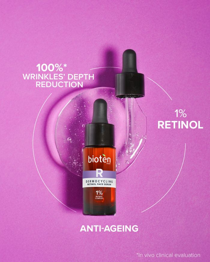 - bioten RETINOL Face Serum με 1% σύμπλεγμα ρετινόλης (0,3% ρετινόλη σε σκουαλένιο & γλυκερίνη): Προάγει την κυτταρική ανανέωση, μειώνει τις ρυτίδες και ενισχύει την ελαστικότητα. Σε 1 μήνα: στο 100%*** των συμμετεχόντων μειώθηκαν οι ρυτίδες, στο 92%* βελτιώθηκε η υφή, και στο 84% ** η ελαστικότητα της επιδερμίδας.